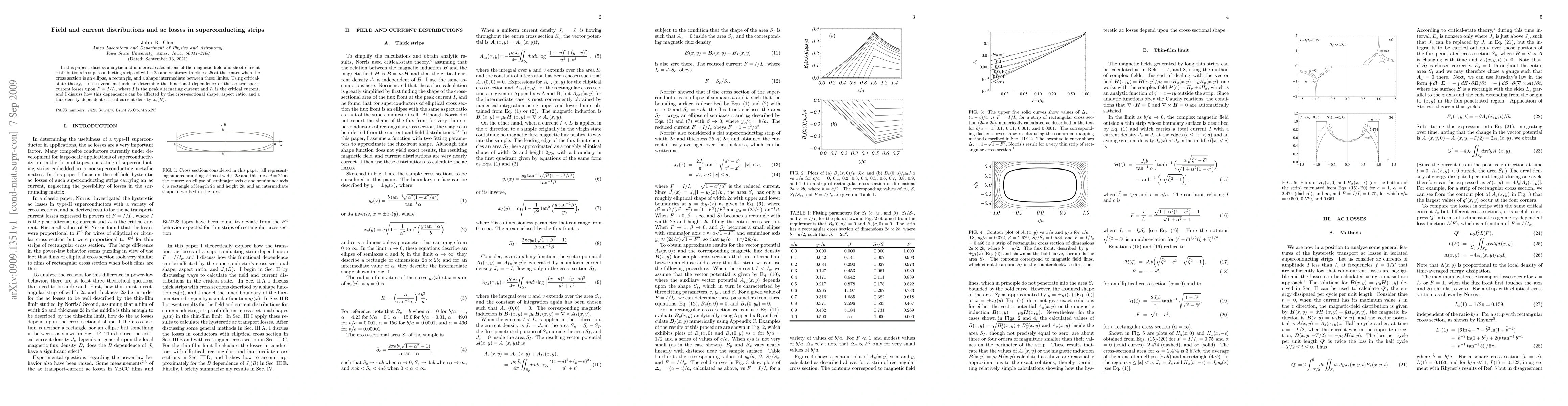 This paper presents analytic and numerical analyses of magnetic-field and sheet-current distributions in superconducting strips of various cross-sectional shapes, and explores the dependence of ac transport-current losses on the ratio of peak alternating current to critical current, considering factors like cross-sectional geometry and flux-density-dependent critical current density.