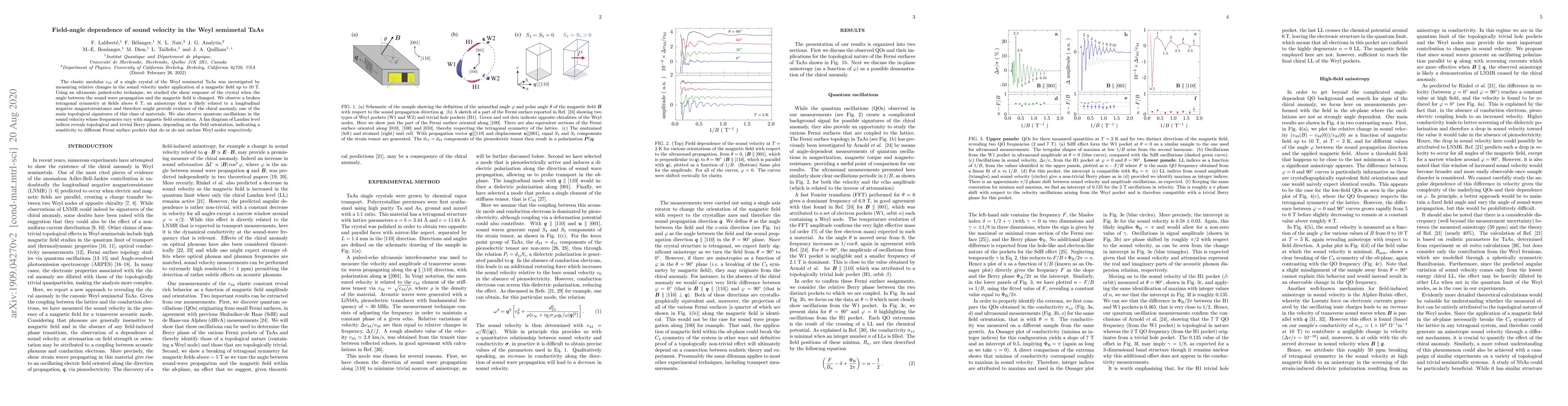 The elastic modulus $c_{44}$ of a single crystal of the Weyl semimetal TaAs was investigated by measuring relative changes in the sound velocity under application of a magnetic field up to 10 T. Using an ultrasonic pulsed-echo technique, we studied the shear response of the crystal when the angle between the sound wave propagation and the magnetic field is changed. We observe a broken tetragonal symmetry at fields above 6 T, an anisotropy that is likely related to a longitudinal negative magnetoresistance and therefore might provide evidence of the chiral anomaly, one of the main topological signatures of this class of materials. We also observe quantum oscillations in the sound velocity whose frequencies vary with magnetic field orientation. A fan diagram of Landau level indices reveals topological and trivial Berry phases, depending on the field orientation, indicating a sensitivity to different Fermi surface pockets that do or do not enclose Weyl nodes respectively.