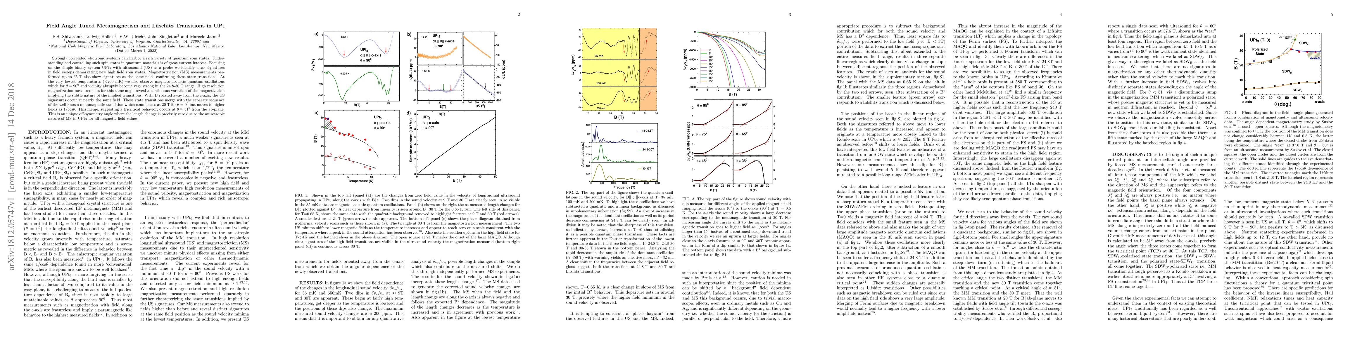 Strongly correlated electronic systems can harbor a rich variety of quantum spin states. Understanding and controlling such spin states in quantum materials is of great current interest. Focusing on the simple binary system UPt3 with ultrasound (US) as a probe we identify clear signatures in field sweeps demarkating new high field spin states. Magnetostriction (MS) measurements performed up to 65 T also show signatures at the same fields confirming these state transitions. At the very lowest temperatures (<200 mK) we also observe magneto-acoustic quantum oscillations which for theta = 90{\deg} and vicinity abruptly become very strong in the 24.8-30 T range. High resolution magnetization measurements for this same angle reveal a continuous variation of the magnetization implying the subtle nature of the implied transitions. With B rotated away from the c-axis, the US signatures occur at nearly the same field. These state transitions merge with the separate sequence of the well known metamagnetic transition which commences at 20 T for theta = 0{\deg} but moves to higher fields as 1/cos(\theta). This merge, suggesting a tricritical behavior, occurs at \theta ~ 51{\deg} from the ab-plane. This is an unique off-symmetry angle where the length change is precisely zero due to the anisotropic nature of MS in UPt3 for all magnetic field values.
