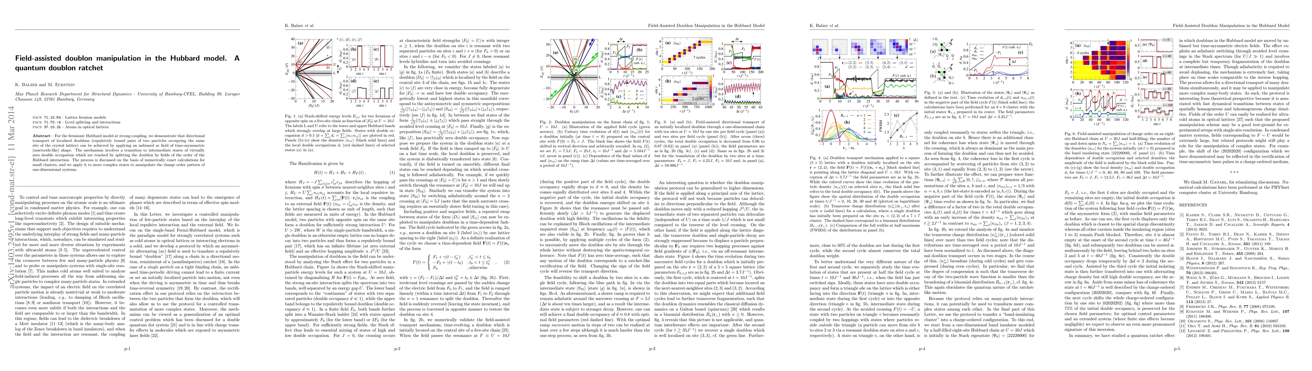 For the fermionic Hubbard model at strong coupling, we demonstrate that directional transport of localized doublons (repulsively bound pairs of two particles occupying the same site of the crystal lattice) can be achieved by applying an unbiased ac field of time-asymmetric (sawtooth-like) shape. The mechanism involves a transition to intermediate states of virtually zero double occupation which are reached by splitting the doublon by fields of the order of the Hubbard interaction. The process is discussed on the basis of numerically exact calculations for small clusters, and we apply it to more complex states to manipulate the charge order pattern of one-dimensional systems.