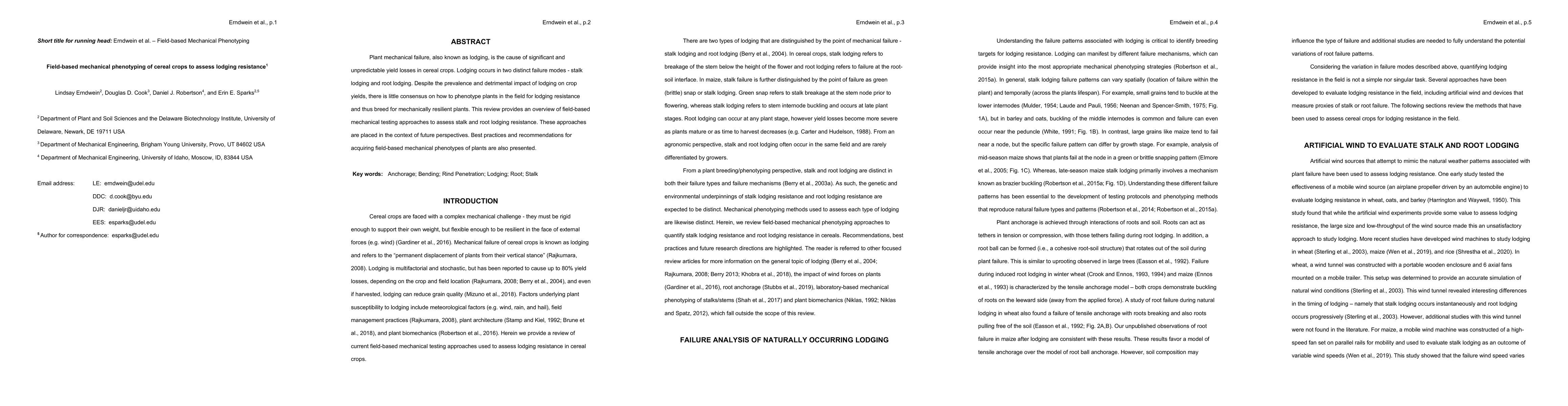A review provides field-based mechanical testing approaches to assess lodging resistance in cereal crops, aiming to breed more resilient plants and reduce yield losses. These methods can help improve understanding of stalk and root lodging resistance.
