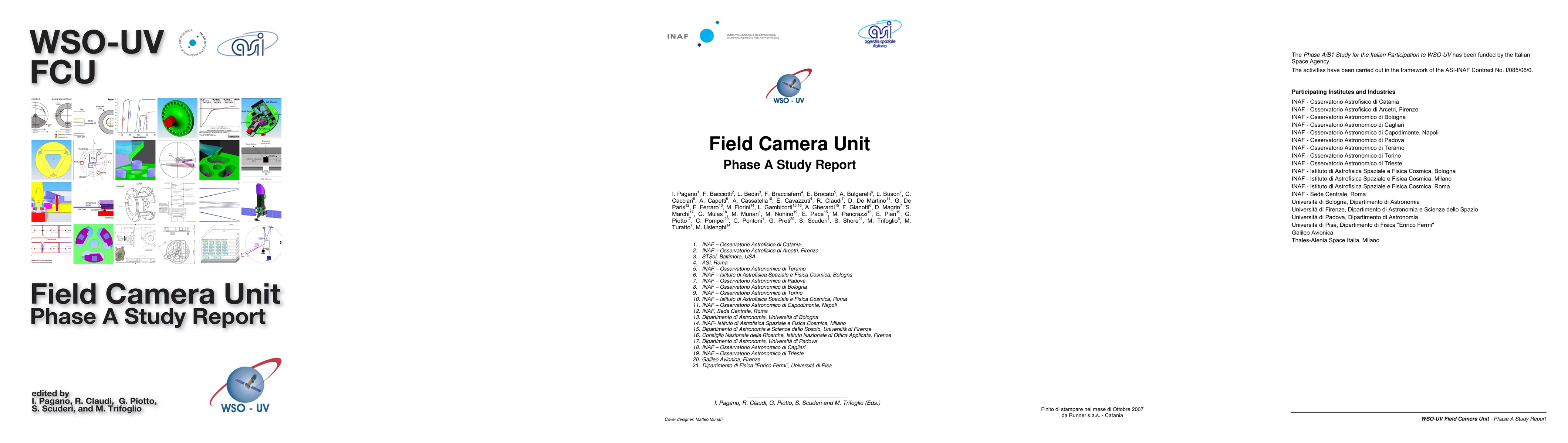 World Space Observatory UltraViolet (WSO-UV) is a multipurpose space observatory, made by a 170 cm aperture telescope, capable of UV high-resolution spectroscopy, long slit low-resolution spectroscopy, and deep UV and optical imaging. With a nominal mission life time of 5 years, and a planned extension to 10 years, from a geosynchronous orbit with an inclination of 51.8 degrees, WSO-UV will provide observations of exceptional importance for the study of many unsolved astrophysical problems. WSO-UV is implemented in the framework of a collaboration between Russia (chair), China, Germany, Italy, Spain, and Ukraine. This book illustrates the results of the feasibility study for the Field Camera Unit (FCU), a multi-spectral radial instrument on the focal plane of WSO-UV. The book provides an overview of the key science topics that are drivers to the participation of the Italian astronomical community in the WSO-UV project. The science drivers here illustrated have been used to define the technical requirements for the conceptual and architectural design of the Field Camera Unit (FCU) focal plane instrument. In Chapter I we show that WSO-UV will give a significant contribution to solve the key astronomical problems individuated by the ASTRONET consortium, and which are driving the European Space Agency Cosmic Vision program. Chapter II elucidates the scientific requirements for WSO-UV FCU instrument, discussed in Chapter I, which are translated in a list of verifiable top level requirements usable to make the conceptual design of the FCU instrument. Chapter III is dedicated to the Field Camera Unit opto-mechanical design, its detectors and electronics subsystems. Finally, Chapter IV outlines the AIV and GSE plans and activities for the FCU instrument.