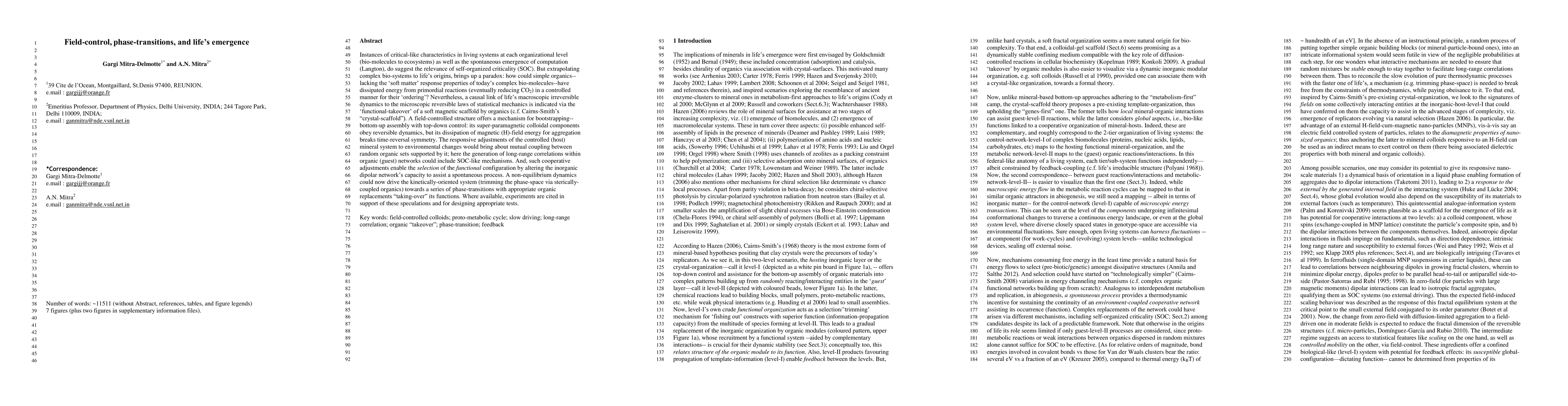 Instances of critical-like characteristics in living systems at each organizational level as well as the spontaneous emergence of computation (Langton), indicate the relevance of self-organized criticality (SOC). But extrapolating complex bio-systems to life's origins, brings up a paradox: how could simple organics--lacking the 'soft matter' response properties of today's bio-molecules--have dissipated energy from primordial reactions in a controlled manner for their 'ordering'? Nevertheless, a causal link of life's macroscopic irreversible dynamics to the microscopic reversible laws of statistical mechanics is indicated via the 'functional-takeover' of a soft magnetic scaffold by organics (c.f. Cairns-Smith's 'crystal-scaffold'). A field-controlled structure offers a mechanism for bootstrapping--bottom-up assembly with top-down control: its super-paramagnetic components obey reversible dynamics, but its dissipation of H-field energy for aggregation breaks time-reversal symmetry. The responsive adjustments of the controlled (host) mineral system to environmental changes would bring about mutual coupling between random organic sets supported by it; here the generation of long-range correlations within organic (guest) networks could include SOC-like mechanisms. And, such cooperative adjustments enable the selection of the functional configuration by altering the inorganic network's capacity to assist a spontaneous process. A non-equilibrium dynamics could now drive the kinetically-oriented system towards a series of phase-transitions with appropriate organic replacements 'taking-over' its functions.