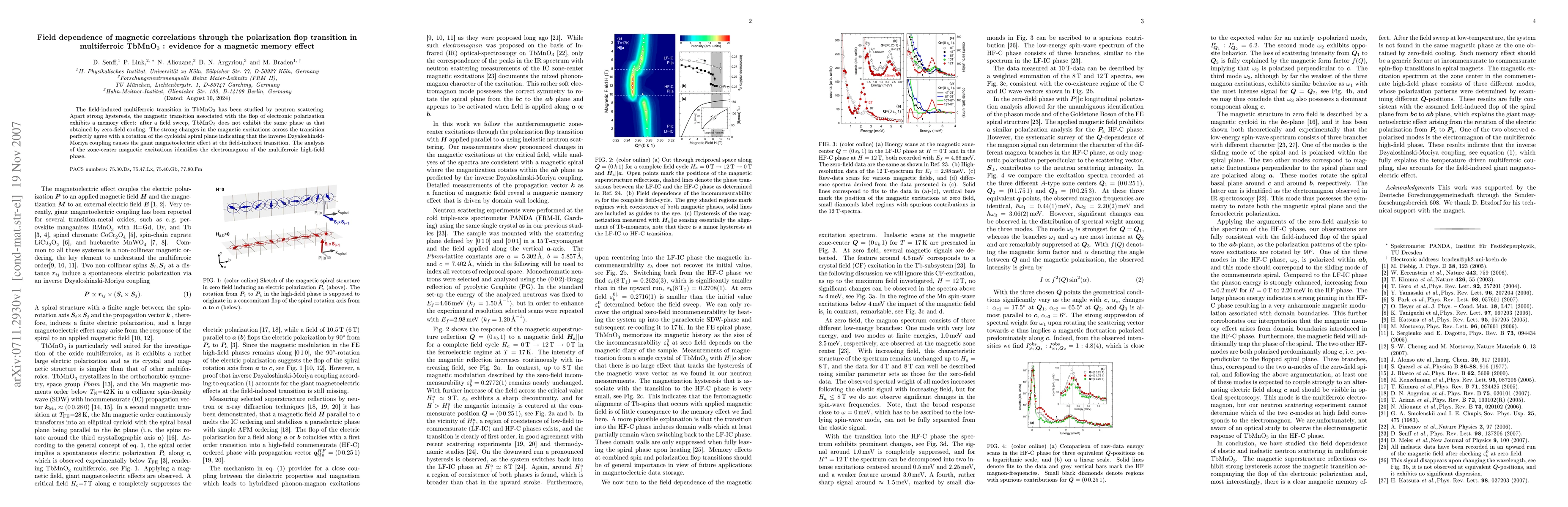 This research investigates the magnetic correlations in TbMnO3 during a field-induced multiferroic transition, revealing a memory effect and a rotation of the cycloidal spiral plane. Neutron scattering identifies an electromagnon in the high-field phase, linking the inverse Dzyaloshinski-Moriya coupling to the giant magnetoelectric effect.