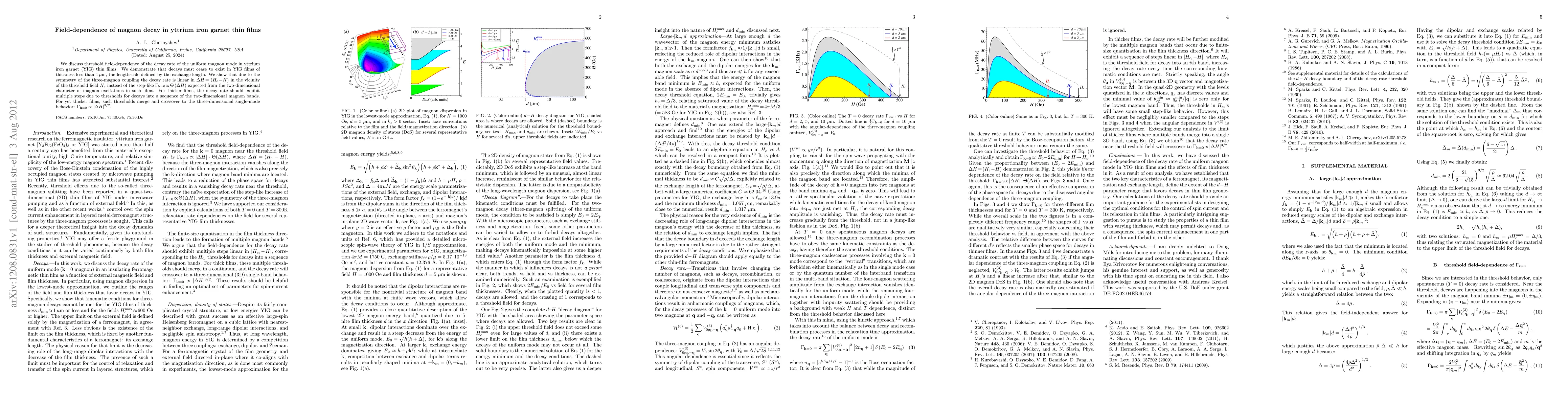 This paper investigates the threshold field-dependence of magnon decay in yttrium iron garnet thin films, revealing that decay ceases in films thinner than 1 µm due to the exchange length. It finds that the decay rate is linear near the threshold field, contrary to the expected step-like behavior, and transitions to a three-dimensional single-mode behavior for thicker films.