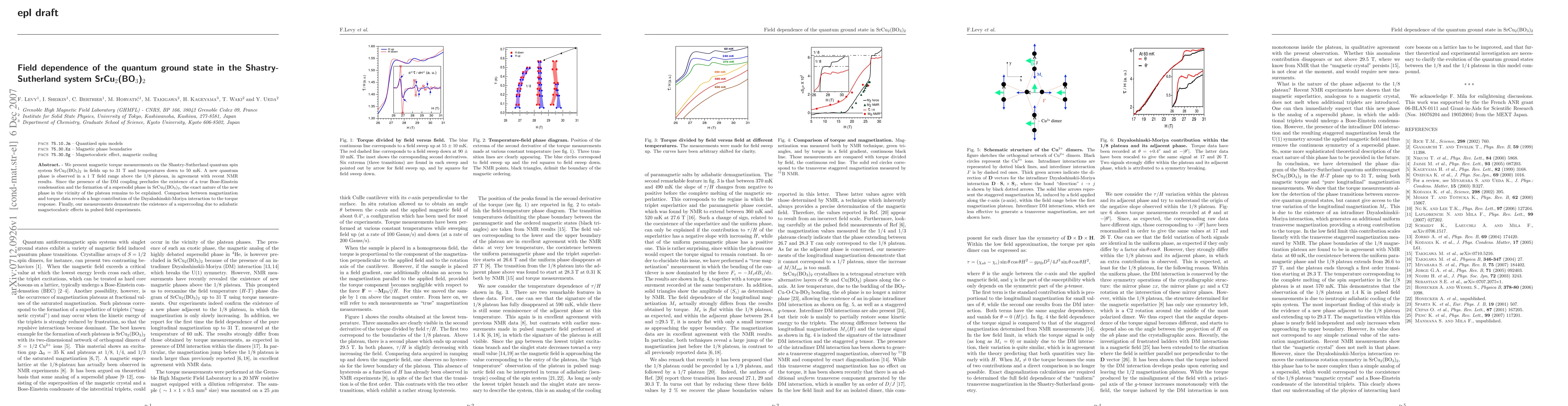 This study reports magnetic torque measurements on the quantum spin system SrCu$_2$(BO$_3$)$_2$ revealing a new quantum phase in a 1 T field range, with significant contributions from the Dzyaloshinskii-Moriya interaction, and evidence of supercooling due to adiabatic magnetocaloric effects. The exact nature of the new phase remains unexplained.