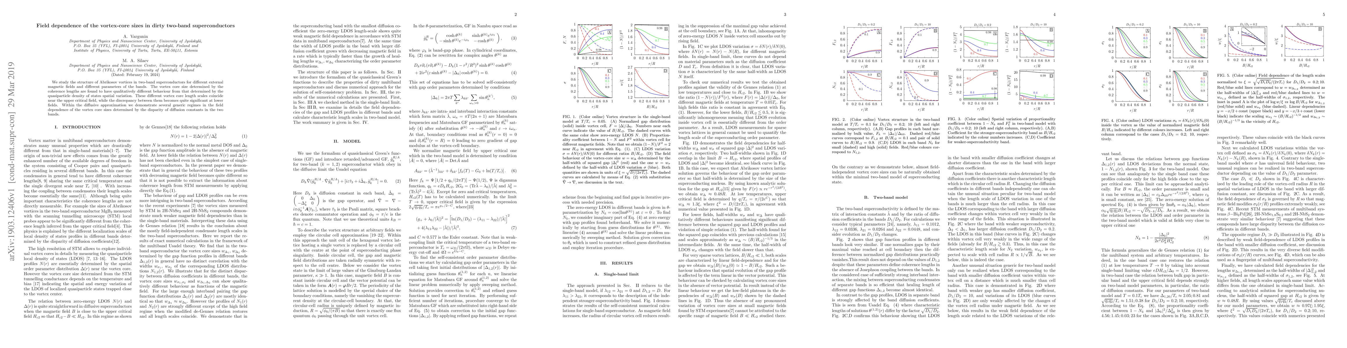 This paper investigates the vortex structure in two-band superconductors under varying magnetic fields, revealing distinct vortex core sizes influenced by coherence lengths and quasiparticle density variations. Near the upper critical field, these core sizes converge, but diverge significantly at lower fields, highlighting different regimes based on the diffusion constants of the bands.