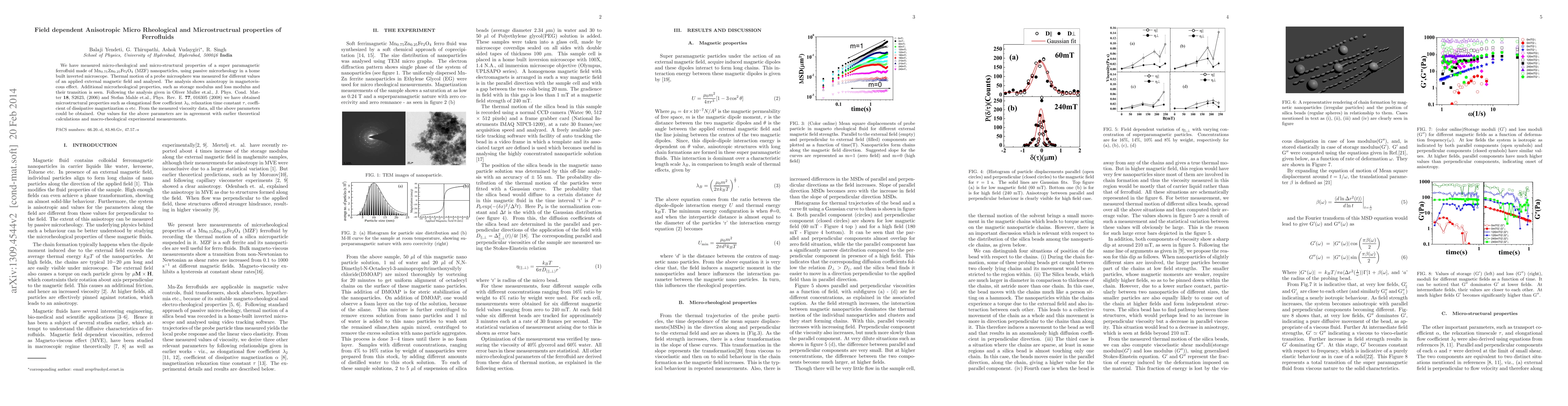 This paper measures micro-rheological and microstructural properties of a superparamagnetic ferrofluid under varying magnetic fields, showing anisotropic magnetoviscous effects and obtaining parameters like elongational flow coefficient and relaxation time constants, which align with prior theoretical and experimental results.