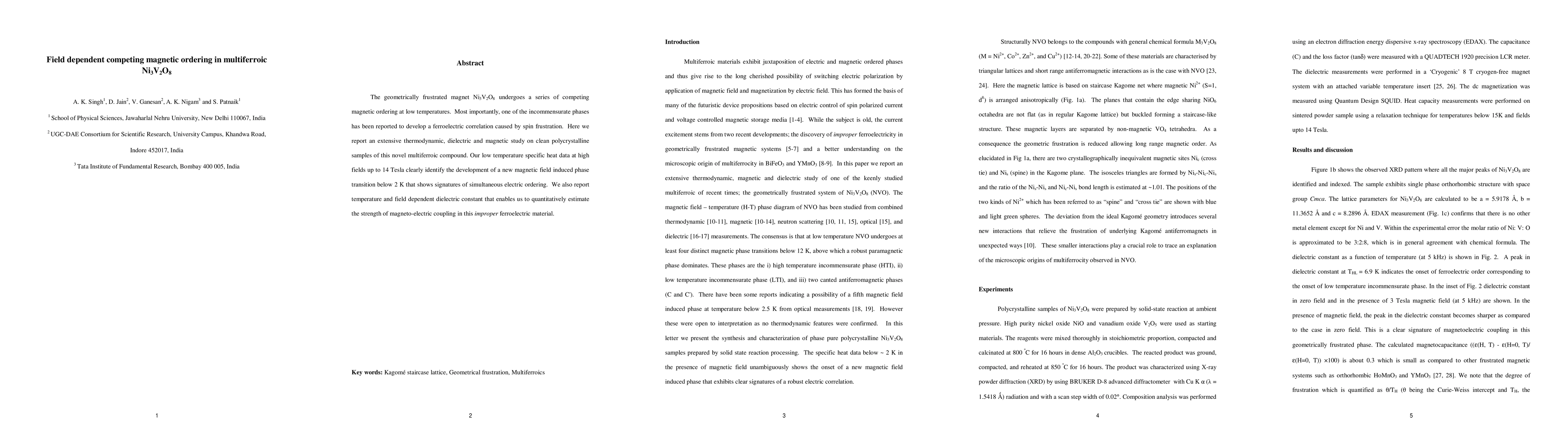 This study investigates the magnetic ordering in the multiferroic compound Ni3V2O8, revealing a new magnetic field induced phase transition below 2 K with signatures of electric ordering. The research quantifies the magneto-electric coupling strength through thermodynamic, dielectric, and magnetic analyses.