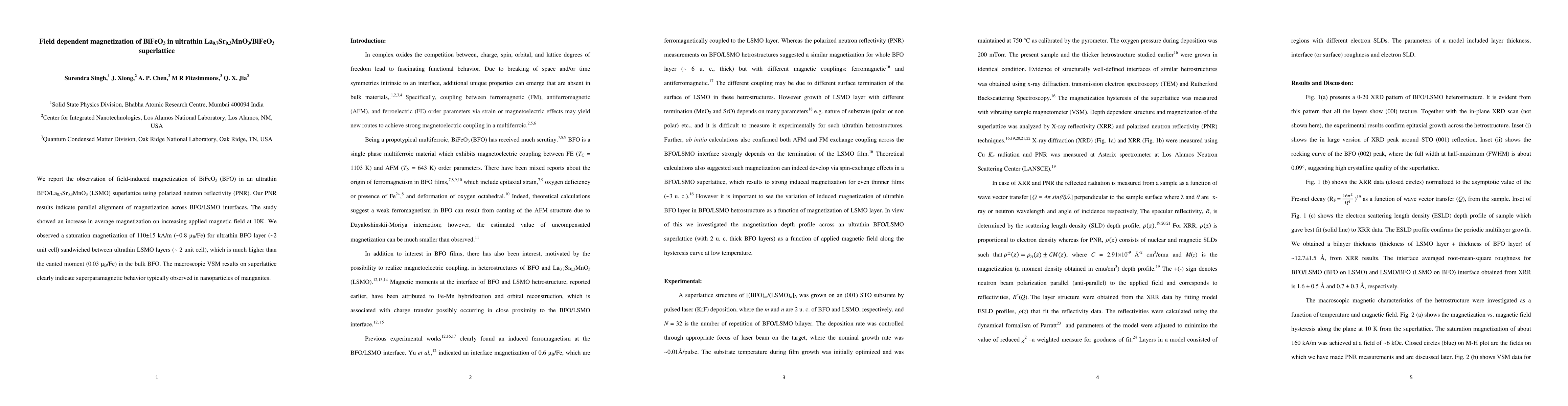 This study reports enhanced field-induced magnetization in ultrathin BiFeO3 (BFO) layers within a BFO/La0.7Sr0.3MnO3 (LSMO) superlattice, observed via polarized neutron reflectivity. The results show increased magnetization and superparamagnetic behavior, with a saturation magnetization significantly higher than in bulk BFO.