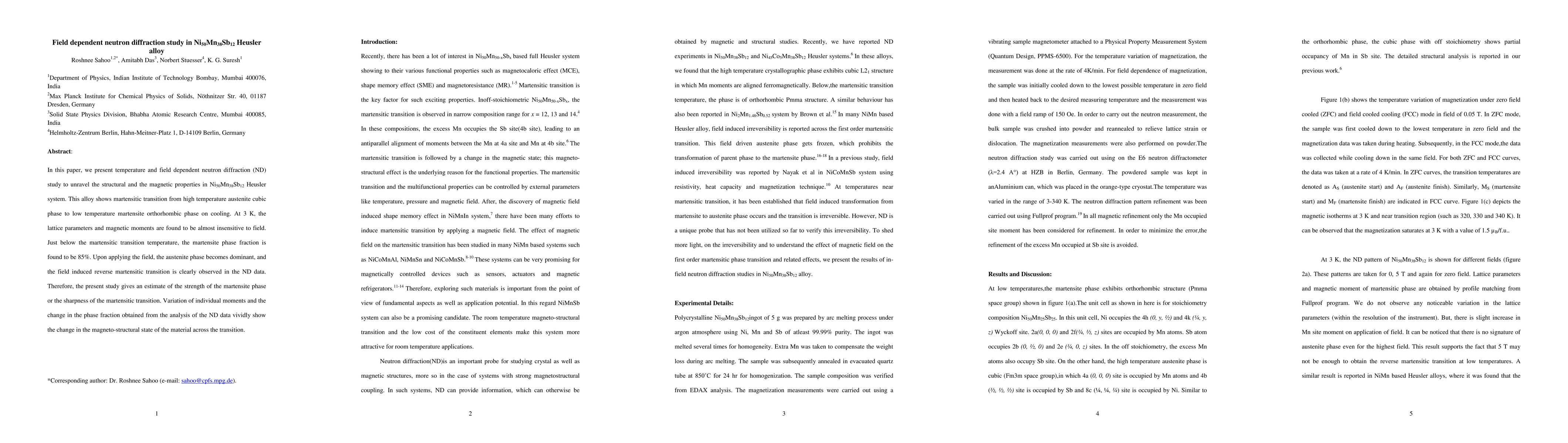 In this paper, we present temperature and field dependent neutron diffraction (ND) study to unravel the structural and the magnetic properties in Ni50Mn38Sb12 Heusler system. This alloy shows martensitic transition from high temperature austenite cubic phase to low temperature martensite orthorhombic phase on cooling. At 3 K, the lattice parameters and magnetic moments are found to be almost insensitive to field. Just below the martensitic transition temperature, the martensite phase fraction is found to be 85%. Upon applying the field, the austenite phase becomes dominant, and the field induced reverse martensitic transition is clearly observed in the ND data. Therefore, the present study gives an estimate of the strength of the martensite phase or the sharpness of the martensitic transition. Variation of individual moments and the change in the phase fraction obtained from the analysis of the ND data vividly show the change in the magneto-structural state of the material across the transition.