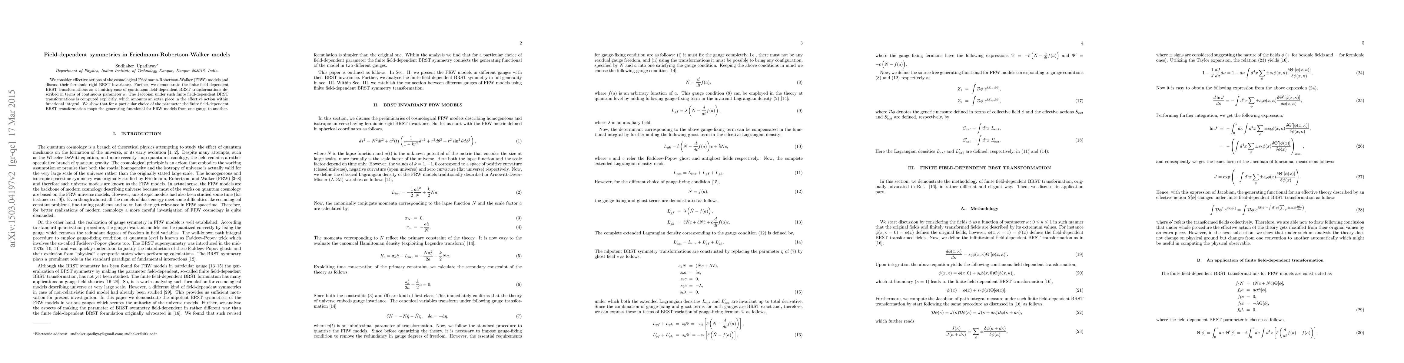 We consider effective actions of the cosmological Friedmann-Robertson-Walker (FRW) models and discuss their fermionic rigid BRST invariance. Further, we demonstrate the finite field-dependent BRST transformations as a limiting case of continuous field-dependent BRST transformations described in terms of continuous parameter $\kappa$. The Jacobian under such finite field-dependent BRST transformations is computed explicitly, which amounts an extra piece in the effective action within functional integral. We show that for a particular choice of the parameter the finite field-dependent BRST transformation maps the generating functional for FRW models from one gauge to another.