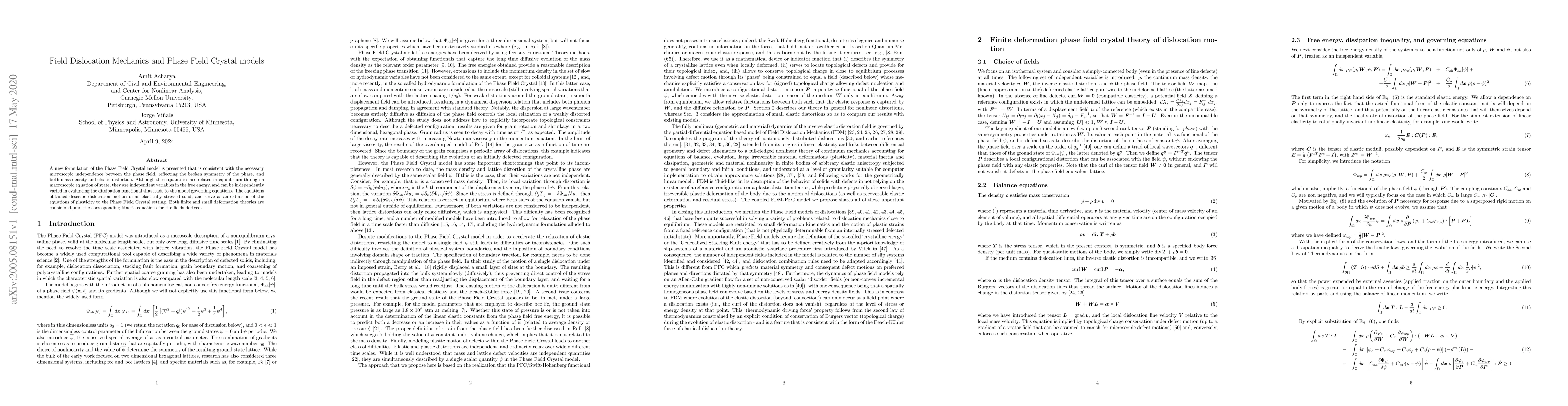 A new formulation of the Phase Field Crystal model is presented that is consistent with the necessary microscopic independence between the phase field, reflecting the broken symmetry of the phase, and both mass density and elastic distortion. Although these quantities are related in equilibrium through a macroscopic equation of state, they are independent variables in the free energy, and can be independently varied in evaluating the dissipation functional that leads to the model governing equations. The equations obtained describe dislocation motion in an elastically stressed solid, and serve as an extension of the equations of plasticity to the Phase Field Crystal setting. Both finite and small deformation theories are considered, and the corresponding kinetic equations for the fields derived.