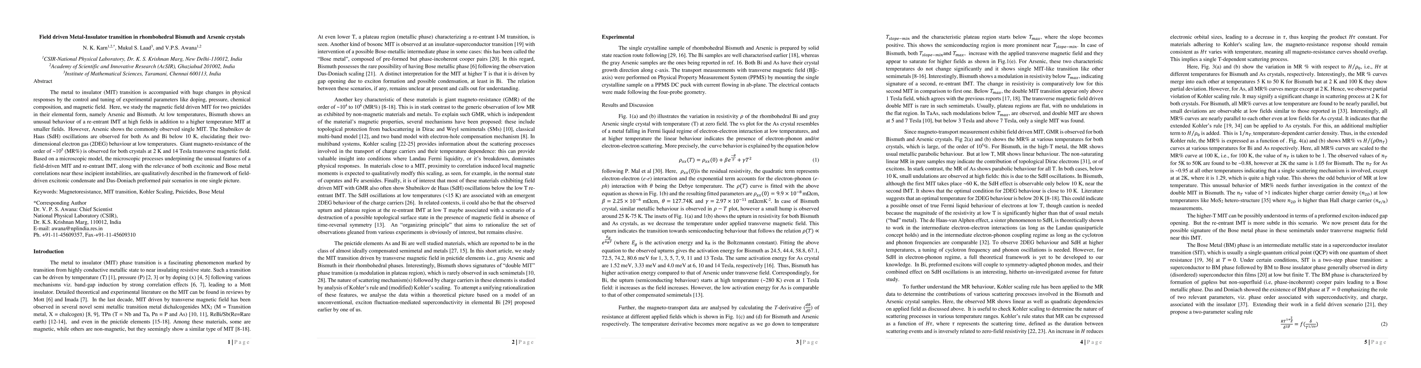 The study investigates magnetic field-driven metal-insulator transitions (MIT) in rhombohedral Bismuth and Arsenic crystals, utilizing magneto-transport measurements and scaling analyses.