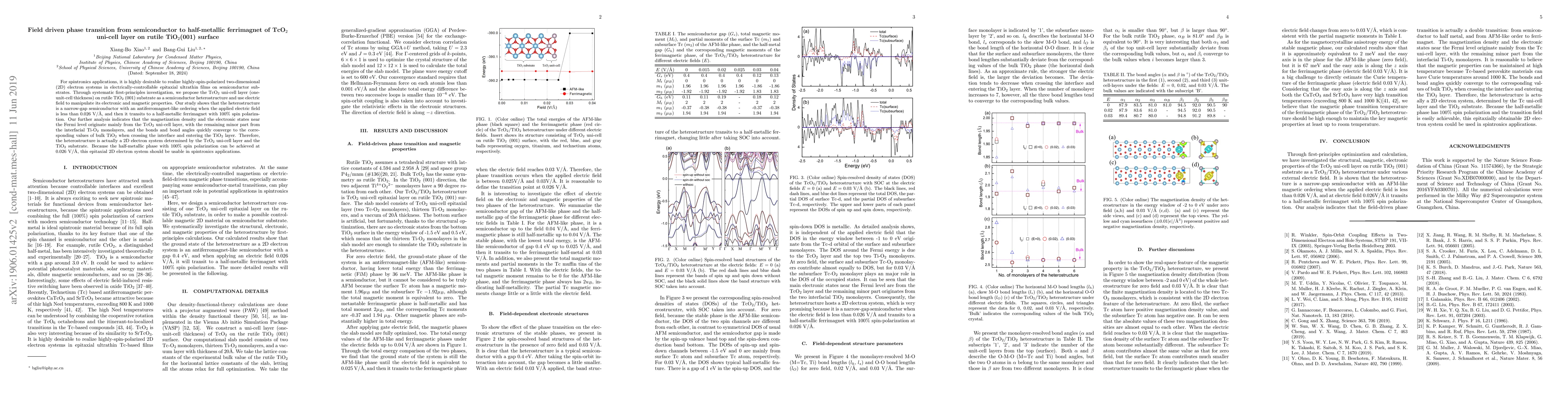 This research proposes a TcO$_2$ uni-cell layer on rutile TiO$_2$ (001) as a semiconductor heterostructure that undergoes a phase transition from a narrow-gap semiconductor to a half-metallic ferrimagnet with 100% spin polarization under an electric field of 0.026 V/\AA. This transition makes it a promising candidate for spintronics applications.