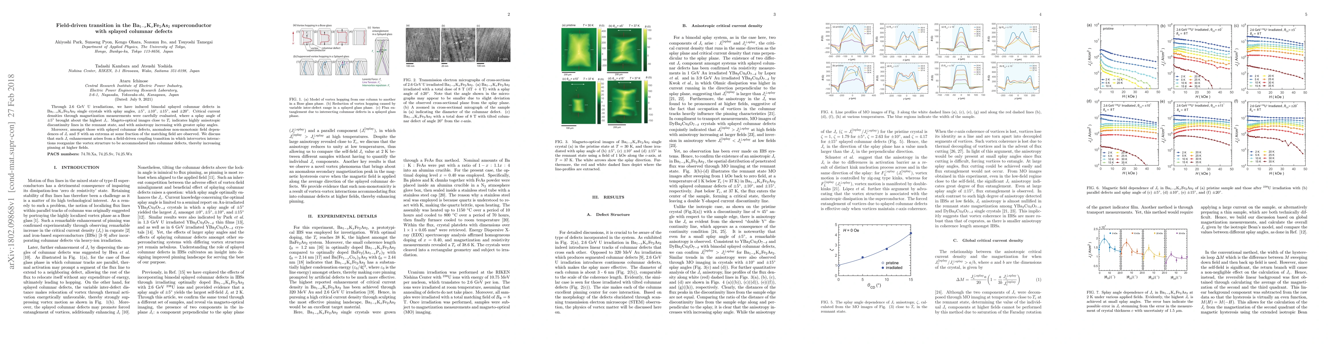 This study investigates the effect of splayed columnar defects on the critical current density in Ba$_{1-x}$K$_x$Fe$_2$As$_2$ superconductors, finding that a splay angle of $\pm 5 ^\circ$ maximizes $J_\mathrm{c}$. Enhanced anisotropy and non-monotonic field dependences suggest a field-driven coupling transition that optimizes vortex pinning in defects.