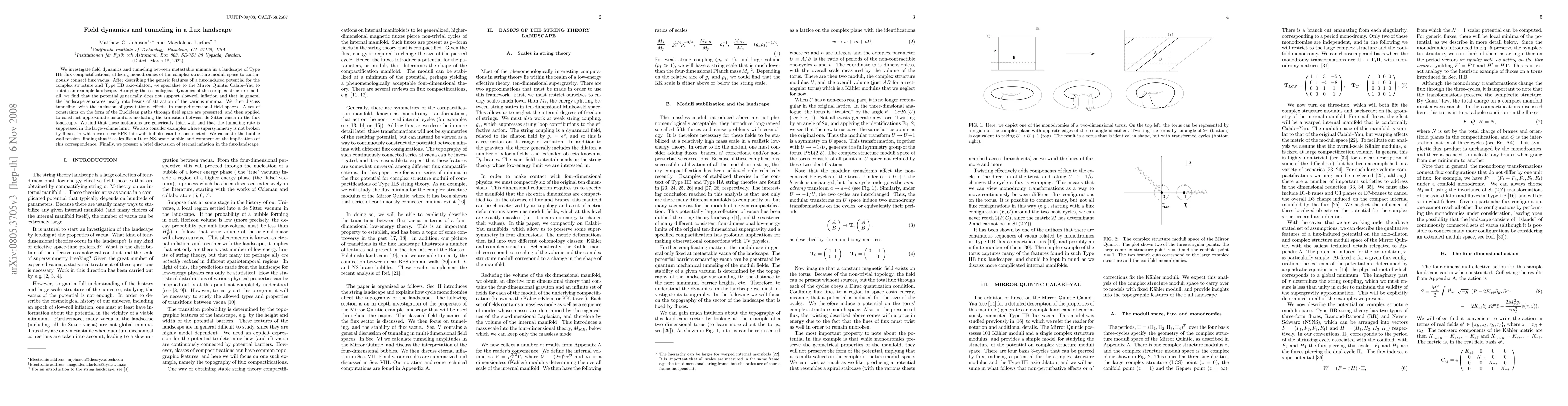The research employs monodromies of the complex structure moduli space to connect flux vacua, generating a continuous potential landscape in Type IIB flux compactifications. It investigates field dynamics and tunneling in this landscape, focusing on the Mirror Quintic Calabi-Yau as an example.
