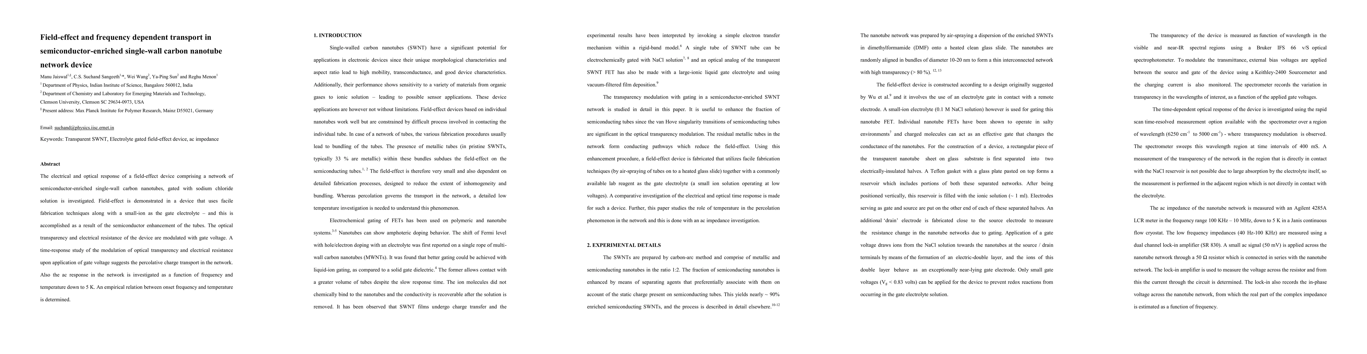 The electrical and optical response of a field-effect device comprising a network of semiconductor-enriched single-wall carbon nanotubes, gated with sodium chloride solution is investigated. Field-effect is demonstrated in a device that uses facile fabrication techniques along with a small-ion as the gate electrolyte - and this is accomplished as a result of the semiconductor enhancement of the tubes. The optical transparency and electrical resistance of the device are modulated with gate voltage. A time-response study of the modulation of optical transparency and electrical resistance upon application of gate voltage suggests the percolative charge transport in the network. Also the ac response in the network is investigated as a function of frequency and temperature down to 5 K. An empirical relation between onset frequency and temperature is determined.