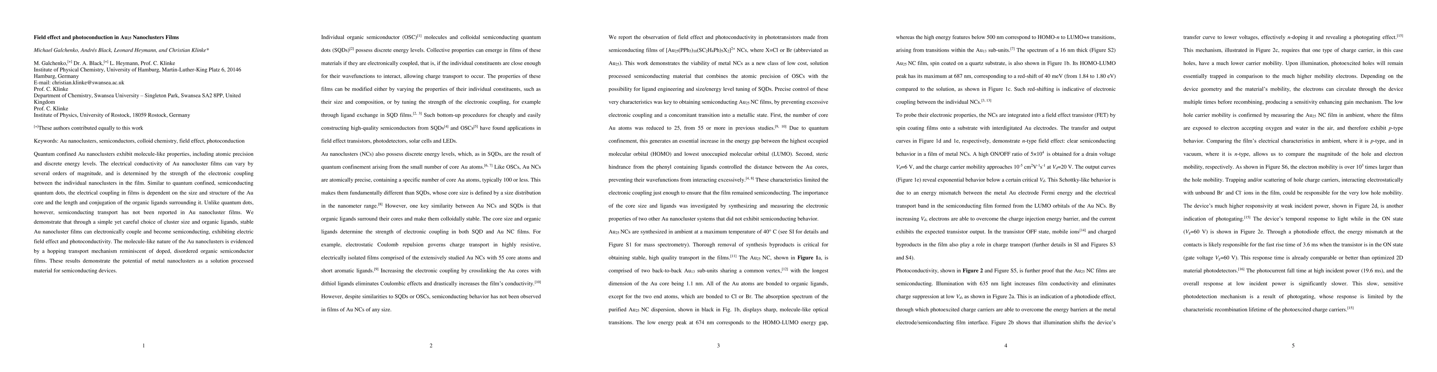 Quantum confined Au nanoclusters exhibit molecule-like properties, including atomic precision and discrete energy levels. The electrical conductivity of Au nanocluster films can vary by several orders of magnitude, and is determined by the strength of the electronic coupling between the individual nanoclusters in the film. Similar to quantum confined, semiconducting quantum dots, the electrical coupling in films is dependent on the size and structure of the Au core and the length and conjugation of the organic ligands surrounding it. Unlike quantum dots, however, semiconducting transport has not been reported in Au nanocluster films. We demonstrate that through a simple yet careful choice of cluster size and organic ligands, stable Au nanocluster films can electronically couple and become semiconducting, exhibiting electric field effect and photoconductivity. The molecule-like nature of the Au nanoclusters is evidenced by a hopping transport mechanism reminiscent of doped, disordered organic semiconductor films. These results demonstrate the potential of metal nanoclusters as a solution processed material for semiconducting devices.