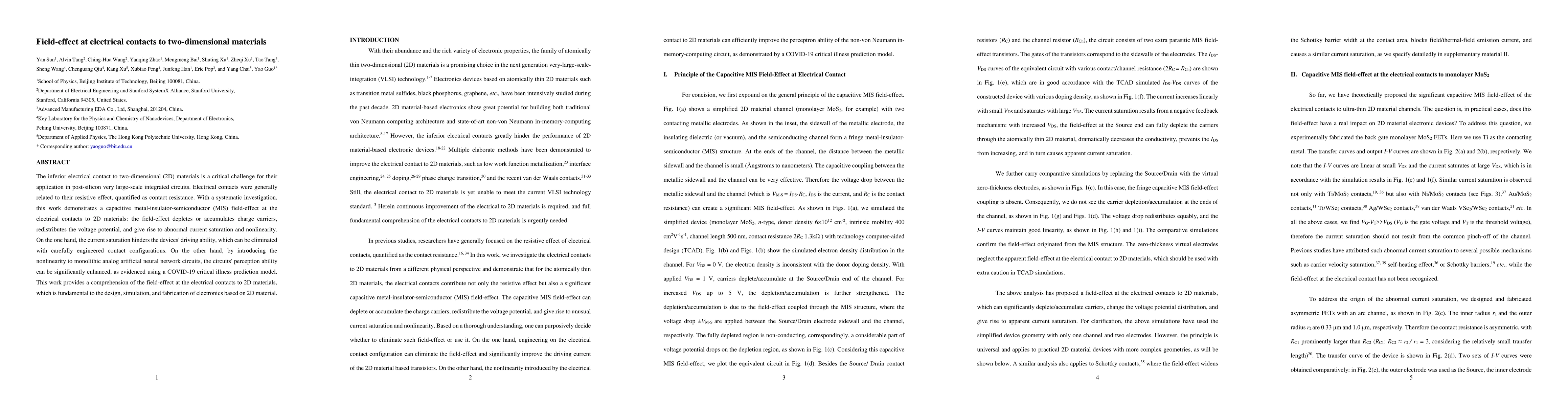 The inferior electrical contact to two-dimensional (2D) materials is a critical challenge for their application in post-silicon very large-scale integrated circuits. Electrical contacts were generally related to their resistive effect, quantified as contact resistance. With a systematic investigation, this work demonstrates a capacitive metal-insulator-semiconductor (MIS) field-effect at the electrical contacts to 2D materials: the field-effect depletes or accumulates charge carriers, redistributes the voltage potential, and give rise to abnormal current saturation and nonlinearity. On the one hand, the current saturation hinders the devices' driving ability, which can be eliminated with carefully engineered contact configurations. On the other hand, by introducing the nonlinearity to monolithic analog artificial neural network circuits, the circuits' perception ability can be significantly enhanced, as evidenced using a COVID-19 critical illness prediction model. This work provides a comprehension of the field-effect at the electrical contacts to 2D materials, which is fundamental to the design, simulation, and fabrication of electronics based on 2D material.
