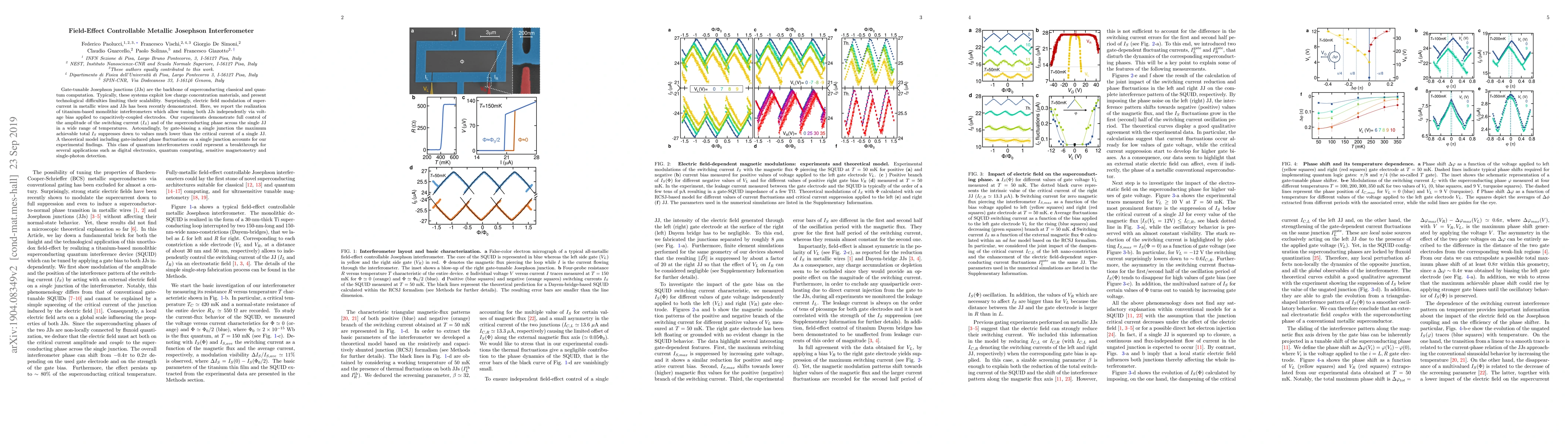 Gate-tunable Josephson junctions (JJs) are the backbone of superconducting classical and quantum computation. Typically, these systems exploit low charge concentration materials, and present technological diffculties limiting their scalability. Surprisingly, electric field modulation of supercurrent in metallic wires and JJs has been recently demonstrated. Here, we report the realization of titanium-based monolithic interferometers which allow tuning both JJs independently via voltage bias applied to capacitively-coupled electrodes. Our experiments demonstrate full control of the amplitude of the switching current (IS) and of the superconducting phase across the single JJ in a wide range of temperatures. Astoundingly, by gate-biasing a single junction the maximum achievable total IS suppresses down to values much lower than the critical current of a single JJ. A theoretical model including gate-induced phase fluctuations on a single junction accounts for our experimental findings. This class of quantum interferometers could represent a breakthrough for several applications such as digital electronics, quantum computing, sensitive magnetometry and single-photon detection.