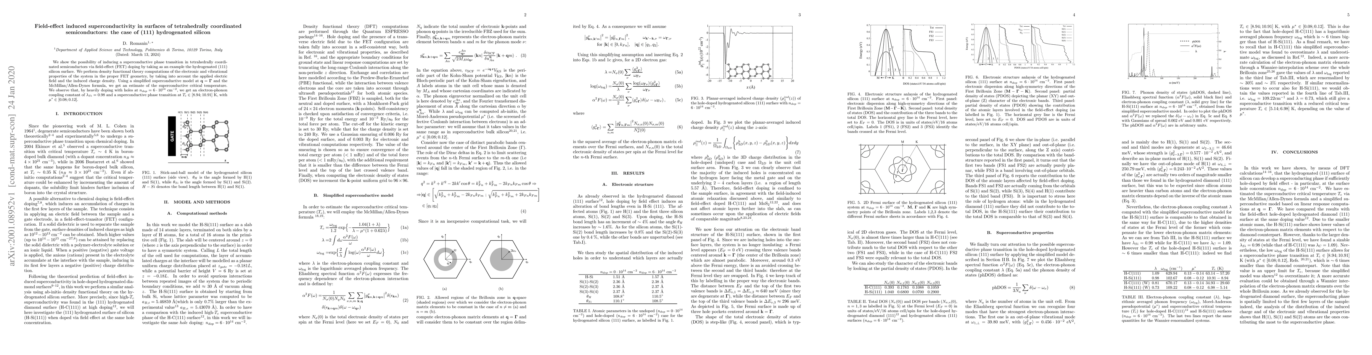 This paper demonstrates the potential for inducing superconductivity in hydrogenated silicon (111) surfaces via field-effect doping, achieving a critical temperature range of 8.94-10.91 K through heavy hole doping and employing density functional theory computations. The study uses a simplified superconducting model and the McMillan/Allen-Dynes formula to estimate these parameters.