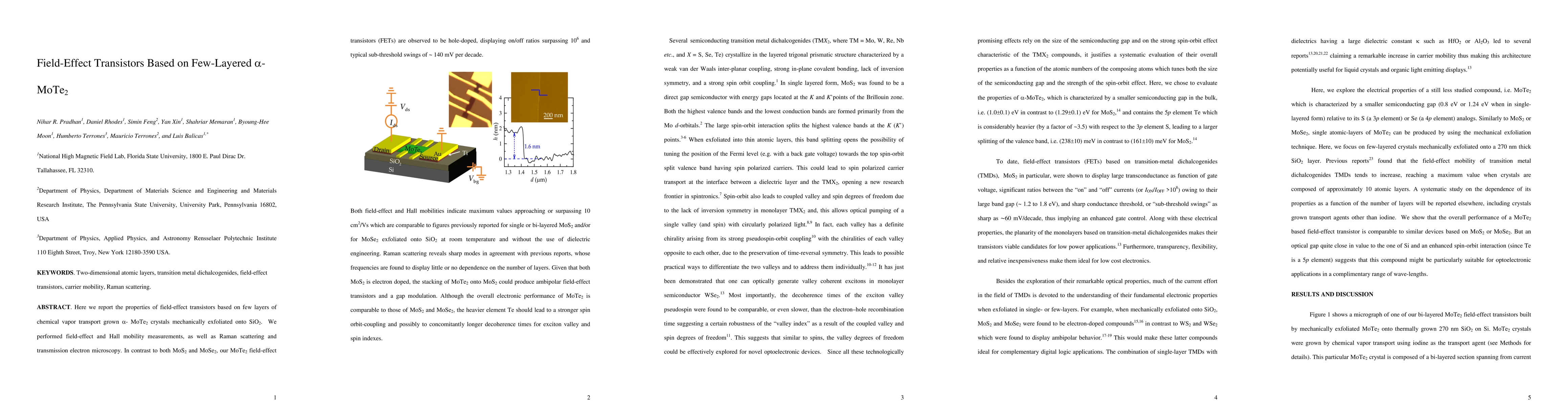 This paper investigates few-layered alpha-MoTe_2 field-effect transistors (FETs) showing hole-doping, high on/off ratios, and comparable field-effect and Hall mobilities to MoS_2 and MoSe_2. The study highlights potential for ambipolar FETs and enhanced spin-orbit coupling due to the heavier Te element.