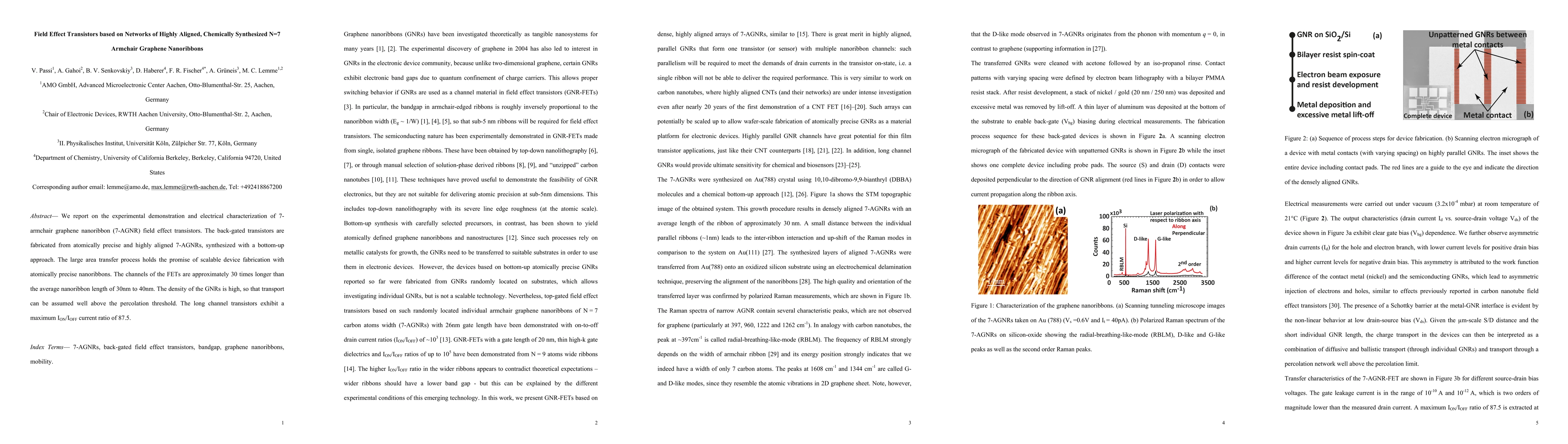 This paper demonstrates the fabrication and electrical characterization of field effect transistors using highly aligned, chemically synthesized N=7 armchair graphene nanoribbons. The transistors show a high I$_{ON}$/I$_{OFF}$ current ratio of 87.5, indicating promising scalability for future device fabrication.