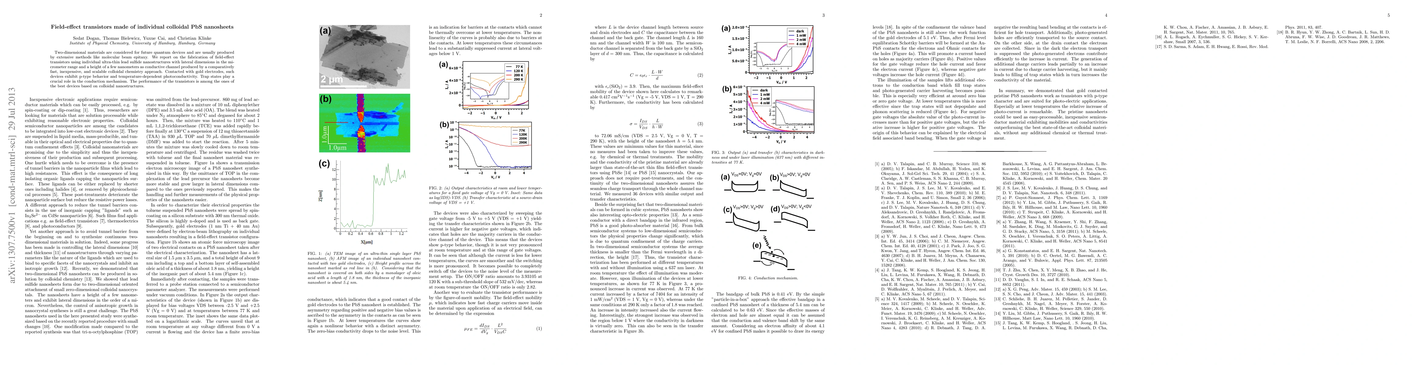 Two-dimensional materials are considered for future quantum devices and are usually produced by extensive methods like molecular beam epitaxy. We report on the fabrication of field-effect transistors using individual ultra-thin lead sulfide nanostructures with lateral dimensions in the micrometer range and a height of a few nanometers as conductive channel produced by a comparatively fast, inexpensive, and scalable colloidal chemistry approach. Contacted with gold electrodes, such devices exhibit p-type behavior and temperature-dependent photoconductivity. Trap states play a crucial role in the conduction mechanism. The performance of the transistors is among the ones of the best devices based on colloidal nanostructures.