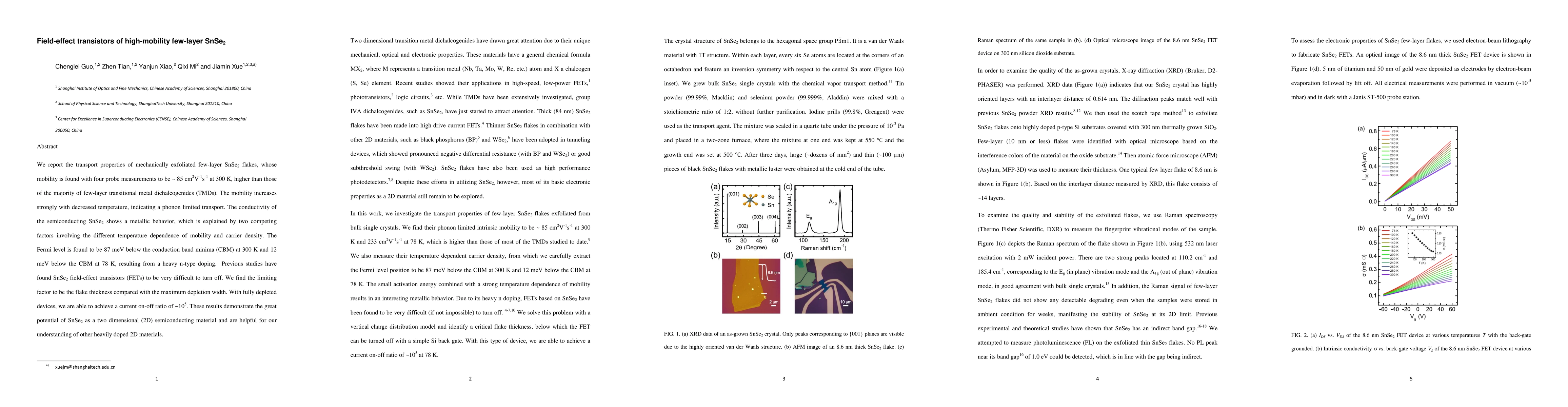 Researchers have created high-mobility transistors from few-layer SnSe2 flakes, achieving a current on-off ratio of 10^5, which demonstrates the material's potential as a two-dimensional semiconducting material.
