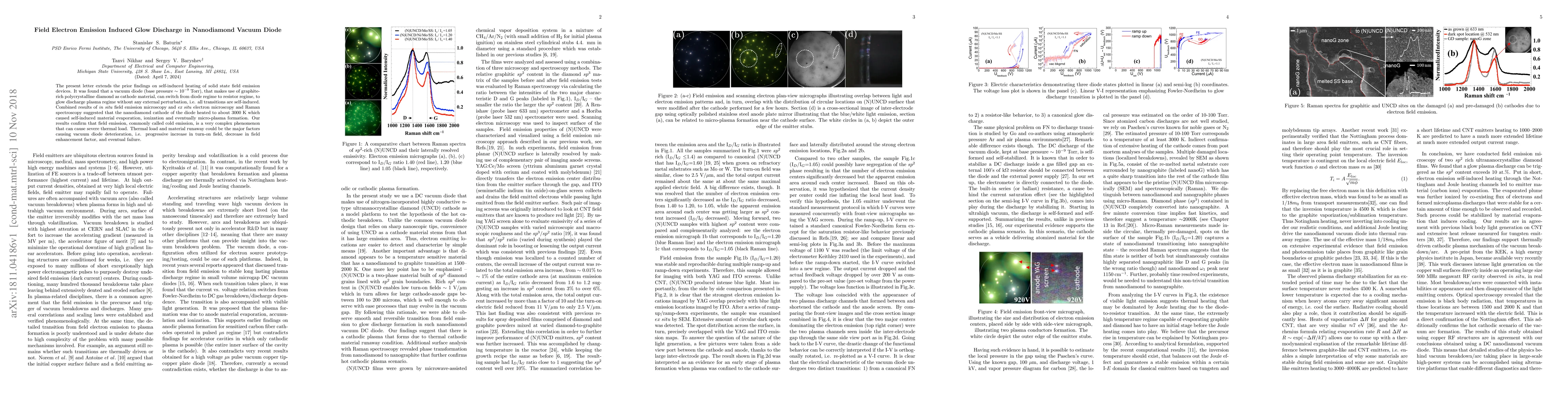This paper investigates the self-induced transitions in a nanodiamond vacuum diode, revealing that field emission can induce glow discharge plasma without external input, leading to severe thermal effects and material evaporation. The findings underscore the complexity of field emission and its potential to cause thermal runaway and diode deterioration.