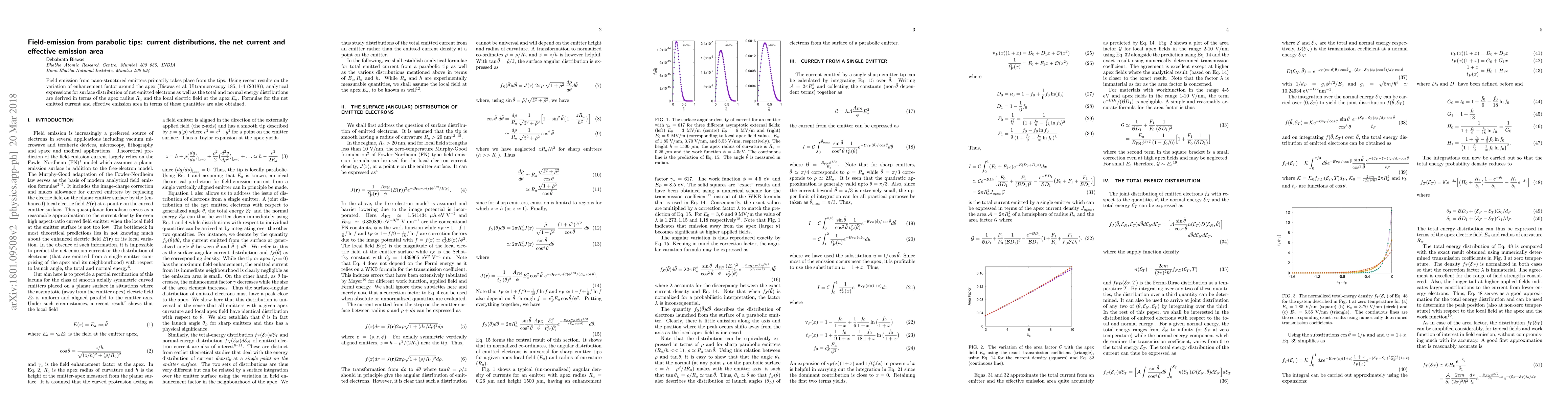 This paper derives analytical expressions for the distribution of net emitted electrons from parabolic tips in field emission, focusing on the total and normal energy distributions. It provides formulas for the net emitted current and effective emission area based on the apex radius and local electric field.