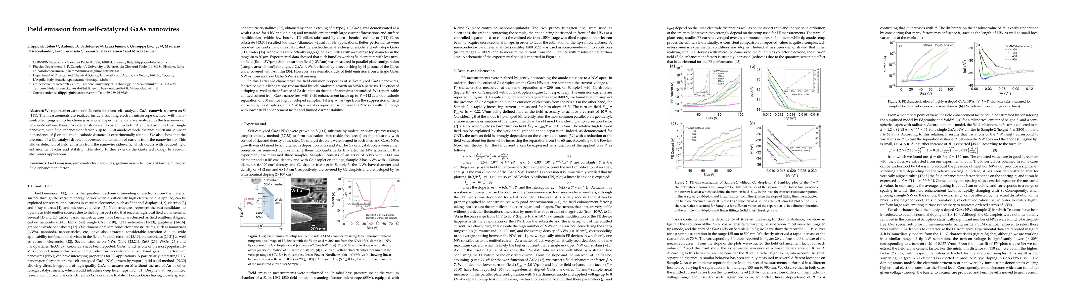 We report observation of field emission from self-catalyzed GaAs nanowires grown on Si (111). The measurements are realized inside a scanning electron microscope chamber with nano-controlled tungsten tip functioning as anode. Experimental data are analyzed in the framework of Fowler-Nordheim theory. We demonstrate stable current up to 10$^{-7}$ A emitted from the tip of single nanowire, with field enhancement factor $\beta$ up to 112 at anode-cathode distance d=350 nm. A linear dependence of $\beta$ on the anode-cathode distance is experimentally found. We also show that the presence of a Ga catalyst droplet suppresses the emission of current from the nanowire tip. This allows detection of field emission from the nanowire sidewalls, which occurs with reduced field enhancement factor and stability. This study further extends the GaAs technology to vacuum electronics applications.