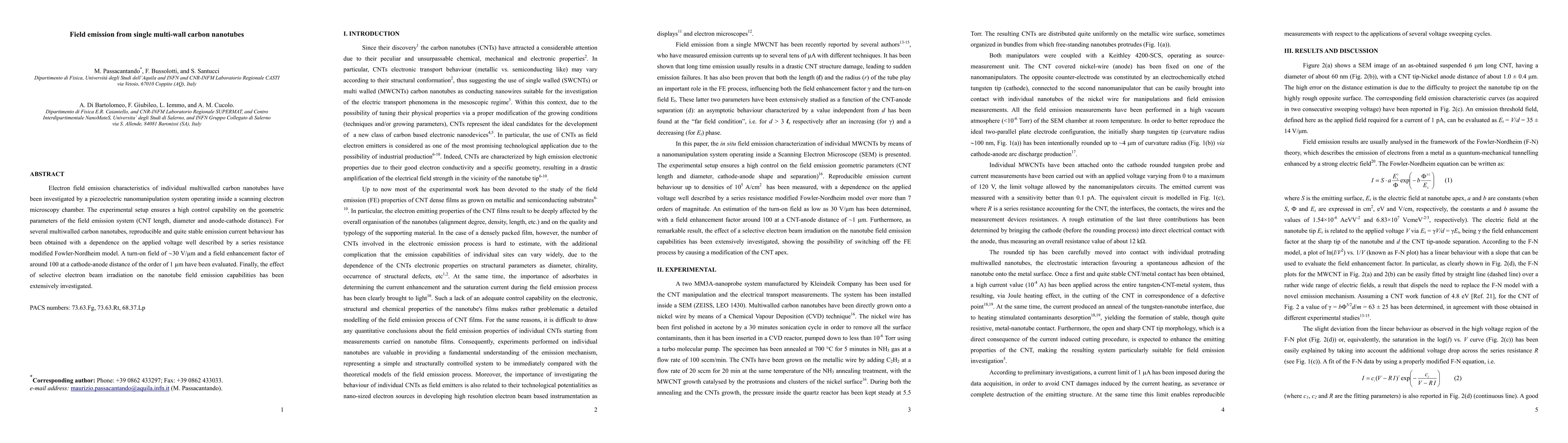 This research investigates the electron field emission from individual multi-wall carbon nanotubes using a piezoelectric nanomanipulation system within an SEM, achieving reproducible emission currents described by a modified Fowler-Nordheim model, with a turn-on field of 30 V/μm and an enhancement factor of 100. The study also assesses the impact of electron beam irradiation on emission capabilities.