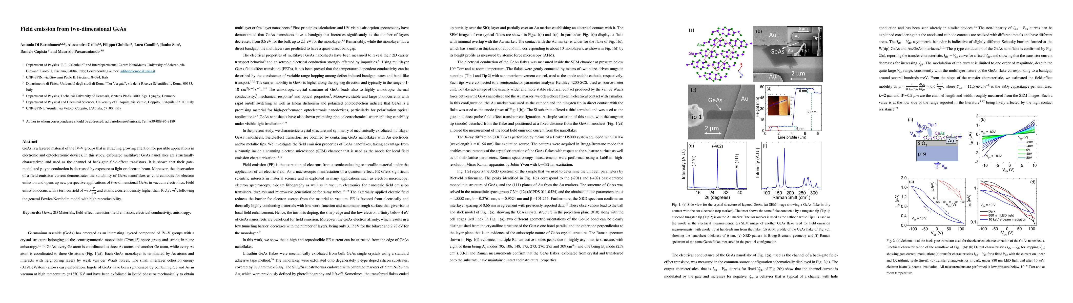 GeAs is a layered material of the IV-V groups that is attracting growing attention for possible applications in electronic and optoelectronic devices. In this study, exfoliated multilayer GeAs nanoflakes are structurally characterized and used as the channel of back-gate field-effect transistors. It is shown that their gate-modulated p-type conduction is decreased by exposure to light or electron beam. Moreover, the observation of a field emission current demonstrates the suitability of GeAs nanoflakes as cold cathodes for electron emission and opens up new perspective applications of two-dimensional GeAs in vacuum electronics. Field emission occurs with a turn-on field of ~80 V/{\mu}m and attains a current density higher than 10 A/cm^2, following the general Fowler-Nordheim model with high reproducibility.