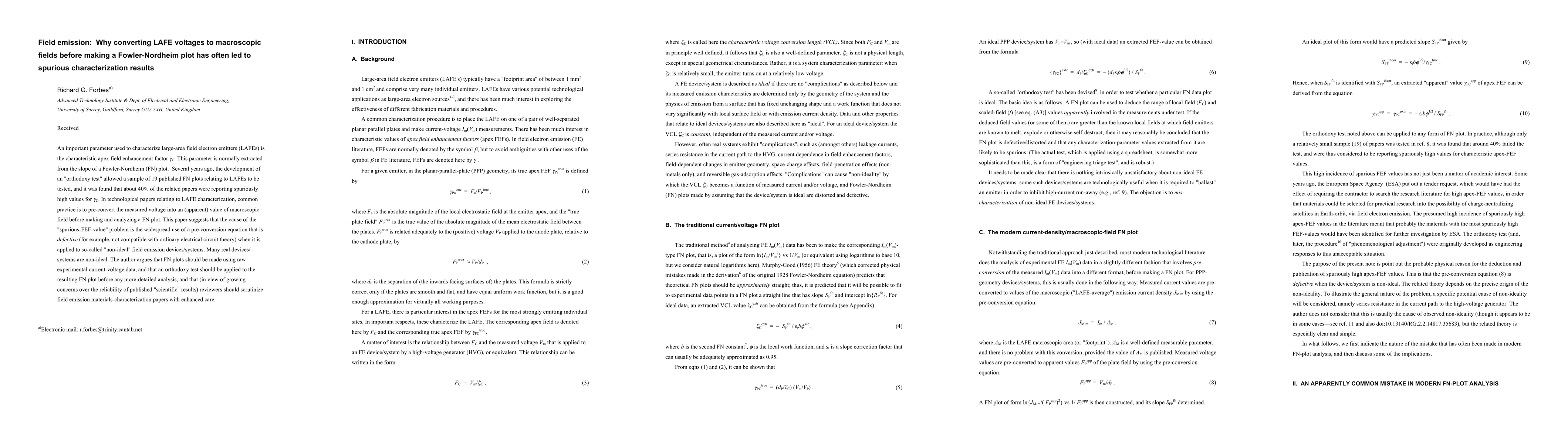This paper highlights that converting LAFE voltages to macroscopic fields before making Fowler-Nordheim plots often leads to spurious characterization results due to the use of defective pre-conversion equations. It recommends analyzing raw current-voltage data directly for FN plots and applying an "orthodoxy test" to ensure reliable characterization of large-area field electron emitters.