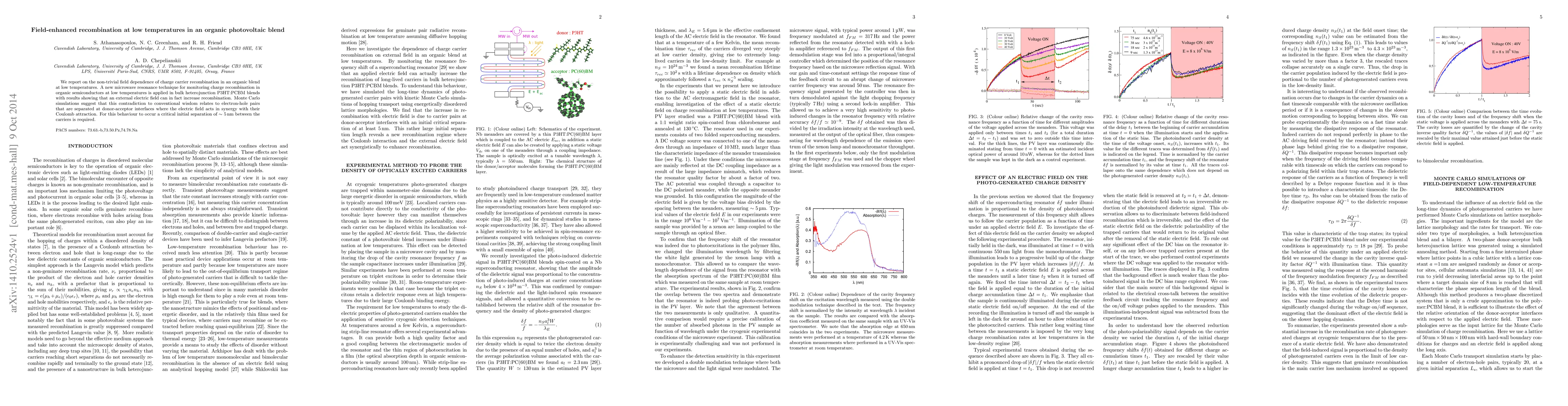 This study reveals that an external electric field can enhance charge carrier recombination in organic photovoltaic blends at low temperatures, contrary to conventional expectations. Using a microwave resonance technique and Monte Carlo simulations, it is shown that this effect depends on a critical initial separation of 5nm between electron-hole pairs at donor-acceptor interfaces.