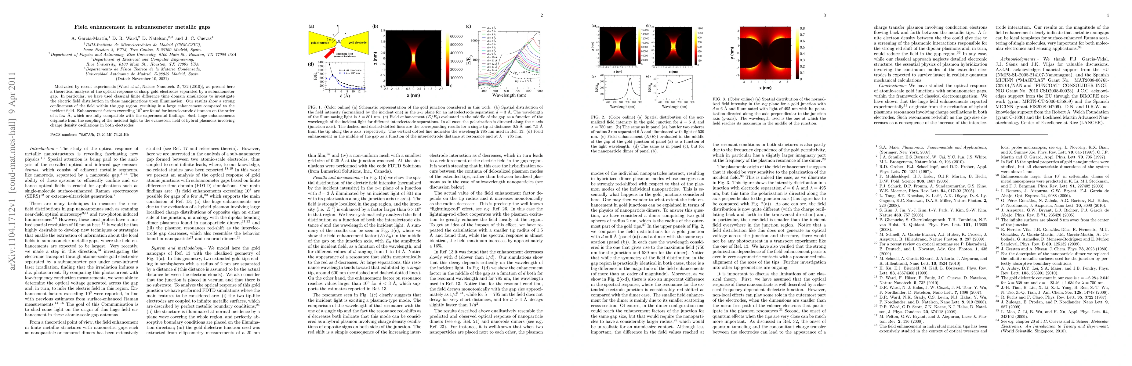 This paper presents a theoretical analysis using finite difference time domain simulations to study the optical response of sharp gold electrodes with subnanometer gaps. The study reveals significant field enhancement within the gap, with factors exceeding 1000, due to the coupling of incident light with the evanescent field of hybrid plasmons.