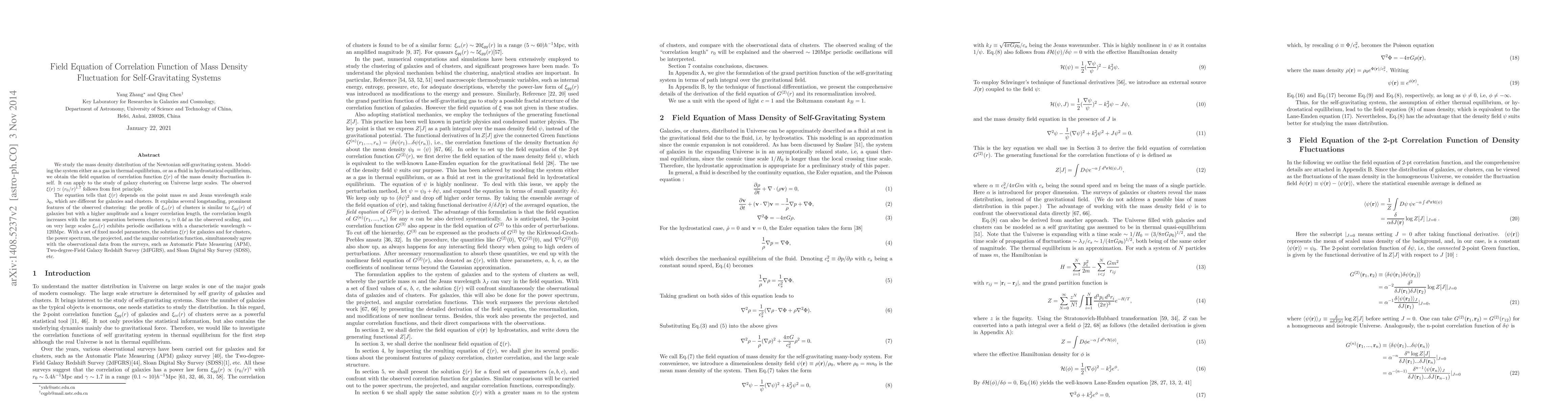 We study the mass density distribution of the Newtonian self-gravitating system. Modeling the system either as a gas in thermal equilibrium, or as a fluid in hydrostatical equilibrium, we obtain the field equation of correlation function $\xi(r)$ of the mass density fluctuation itself. It can apply to the study of galaxy clustering on Universe large scales. The observed $\xi(r)\simeq (r_0/r)^{1.7}$ follows from first principle. The equation tells that $\xi(r)$ depends on the point mass $m$ and Jeans wavelength scale $\lambda_{0}$, which are different for galaxies and clusters. It explains several longstanding, prominent features of the observed clustering: the profile of $\xi_{cc}(r)$ of clusters is similar to $\xi_{gg}(r)$ of galaxies but with a higher amplitude and a longer correlation length, the correlation length increases with the mean separation between clusters $r_0\simeq 0.4d$ as the observed scaling, and on very large scales $\xi_{cc}(r)$ exhibits periodic oscillations with a characteristic wavelength $\sim 120$Mpc. With a set of fixed model parameters, the solution $\xi(r)$ for galaxies and for clusters, the power spectrum, the projected, and the angular correlation function, simultaneously agree with the observational data from the surveys, such as Automatic Plate Measuring (APM), Two-degree-Field Galaxy Redshift Survey (2dFGRS), and Sloan Digital Sky Survey (SDSS), etc.
