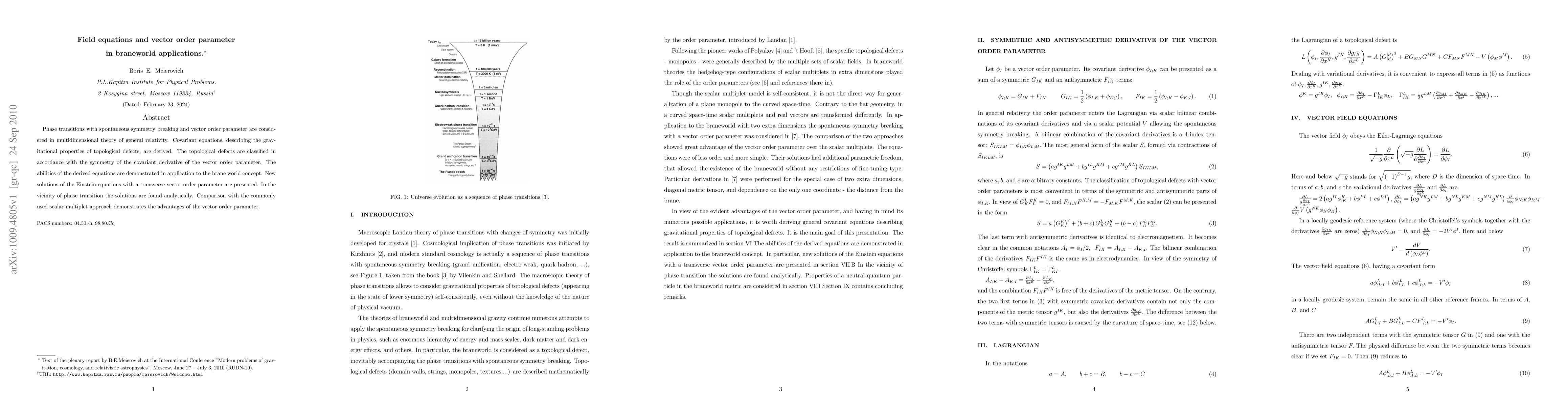 Phase transitions with spontaneous symmetry breaking and vector order parameter are considered in multidimensional theory of general relativity. Covariant equations, describing the gravitational properties of topological defects, are derived. The topological defects are classified in accordance with the symmetry of the covariant derivative of the vector order parameter. The abilities of the derived equations are demonstrated in application to the brane world concept. New solutions of the Einstein equations with a transverse vector order parameter are presented. In the vicinity of phase transition the solutions are found analytically. Comparison with the commonly used scalar multiplet approach demonstrates the advantages of the vector order parameter.