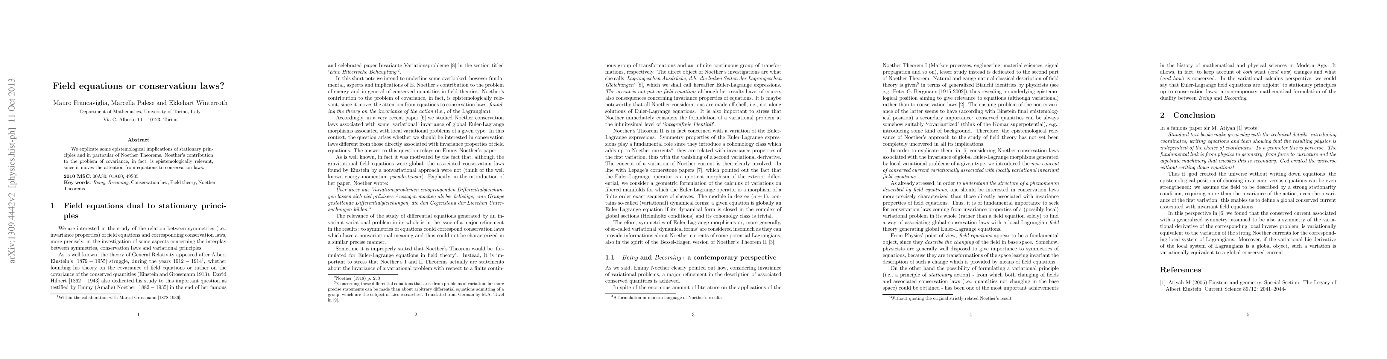 We explicate some epistemological implications of stationary principles and in particular of Noether Theorems. Noether's contribution to the problem of covariance, in fact, is epistemologically relevant, since it moves the attention from equations to conservation laws.
