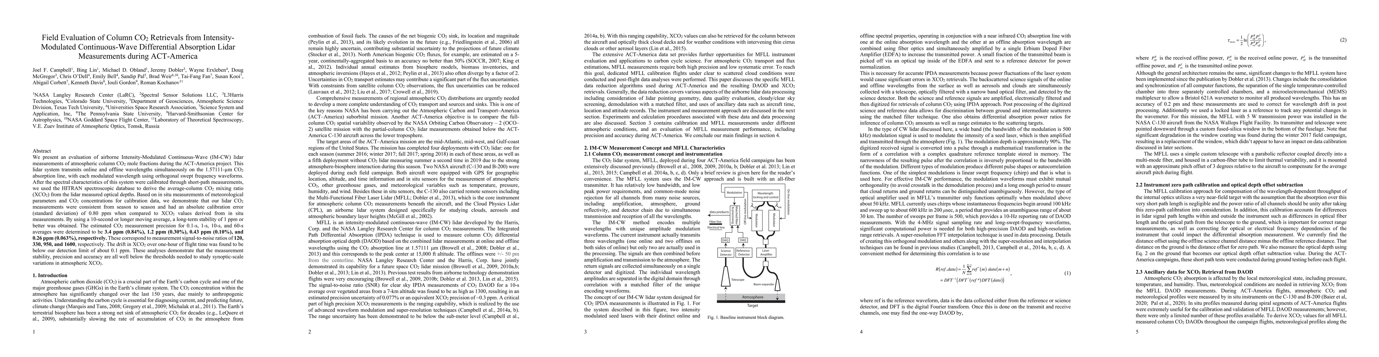 This study evaluates airborne IM-CW lidar measurements of atmospheric column CO2 mole fractions during the ACT-America project, demonstrating high precision and stability with an absolute calibration error of 0.80 ppm and a long-term stability of 1 ppm or better, suitable for studying synoptic-scale variations in atmospheric CO2.