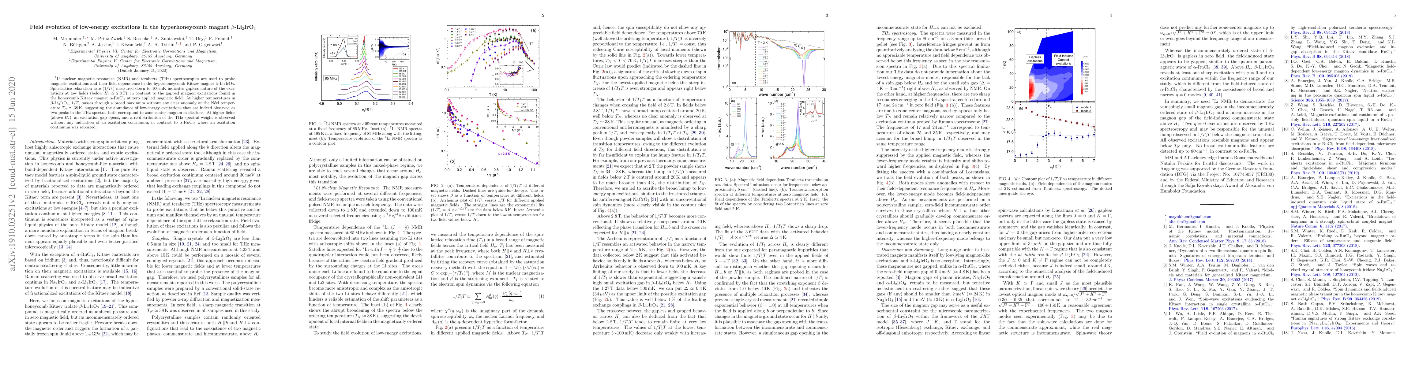 $^7$Li nuclear magnetic resonance (NMR) and terahertz (THz) spectroscopies are used to probe magnetic excitations and their field dependence in the hyperhoneycomb Kitaev magnet $\beta$-Li$_2$IrO$_3$. Spin-lattice relaxation rate ($1/T_1$) measured down to 100\,mK indicates gapless nature of the excitations at low fields (below $H_c\simeq 2.8$\,T), in contrast to the gapped magnon excitations found in the honeycomb Kitaev magnet $\alpha$-RuCl$_3$ at zero applied magnetic field. At higher temperatures in $\beta$-Li$_2$IrO$_3$, $1/T_1$ passes through a broad maximum without any clear anomaly at the N\'eel temperature $T_N\simeq 38$\,K, suggesting the abundance of low-energy excitations that are indeed observed as two peaks in the THz spectra, both correspond to zone-center magnon excitations. At higher fields (above $H_c$), an excitation gap opens, and a re-distribution of the THz spectral weight is observed without any indication of an excitation continuum, in contrast to $\alpha$-RuCl$_3$ where an excitation continuum was reported.