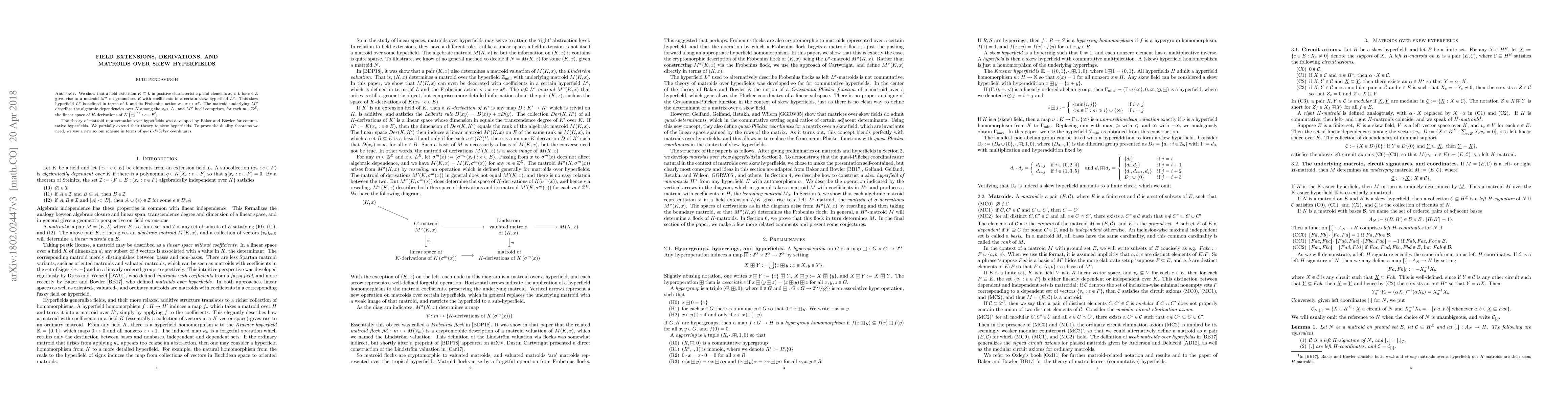 This paper constructs a matroid $M^\sigma$ over a skew hyperfield $L^\sigma$ from a field extension $K\subseteq L$ in positive characteristic $p$, showing how algebraic dependencies among elements $x_e\in L$ relate to derivations. It extends the theory of matroid representation from commutative to skew hyperfields using a new axiom scheme based on quasi-Plücker coordinates.