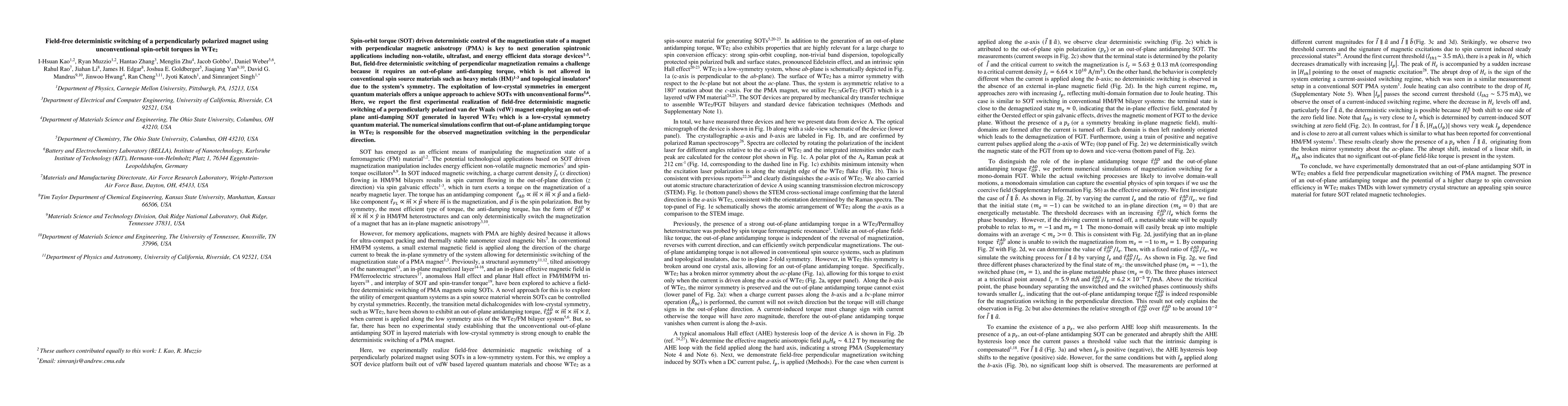 This research demonstrates field-free deterministic switching of a perpendicularly polarized magnet using unconventional spin-orbit torques in WTe2, a material with low-crystal symmetry. Numerical simulations attribute the observed switching to an out-of-plane anti-damping torque in WTe2, offering a novel approach for next-generation spintronic applications.