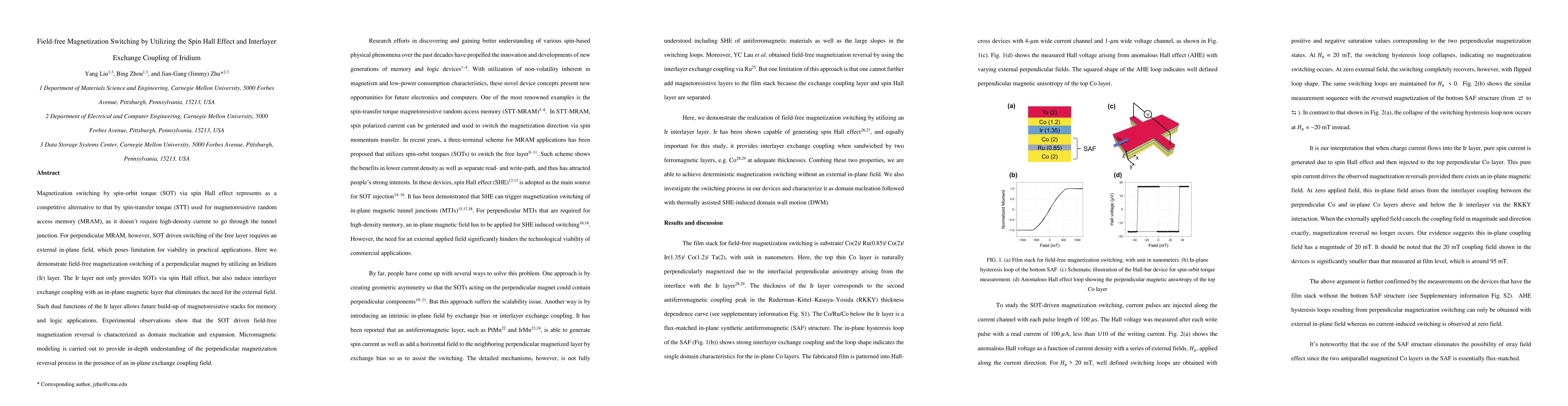 This paper demonstrates field-free magnetization switching in perpendicular MRAM using Iridium to generate spin-orbit torque via the spin Hall effect and interlayer exchange coupling, thus eliminating the need for an external in-plane field. Experimental and micromagnetic modeling confirm the domain nucleation and expansion mechanism for this switching process.