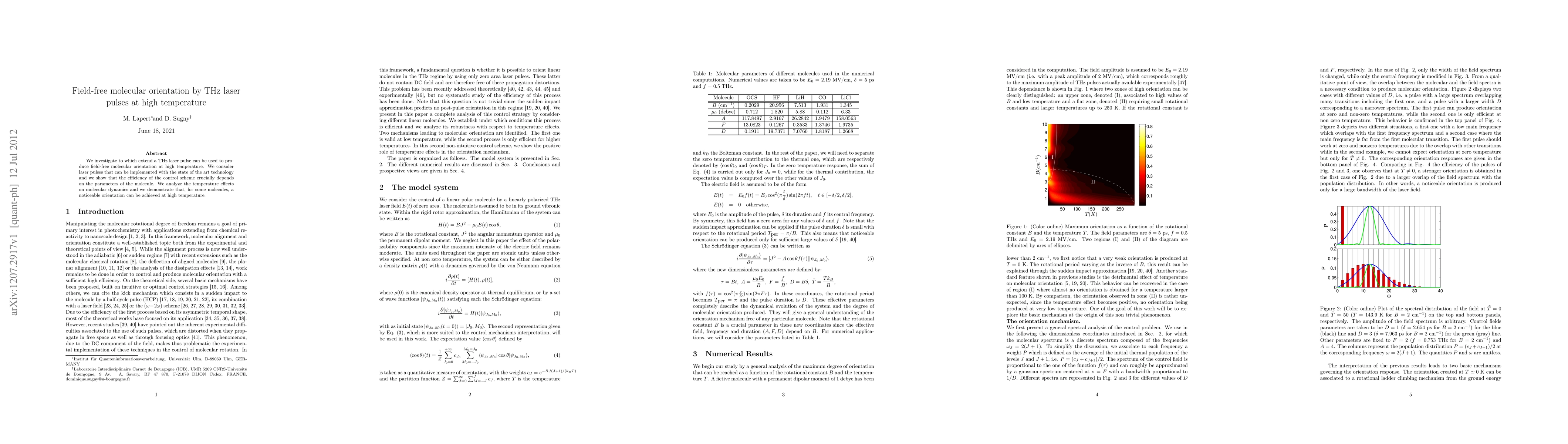 This research explores the potential of THz laser pulses to achieve field-free molecular orientation at elevated temperatures, demonstrating that the effectiveness hinges on molecular parameters and that high temperatures can still allow for significant orientation in certain molecules.