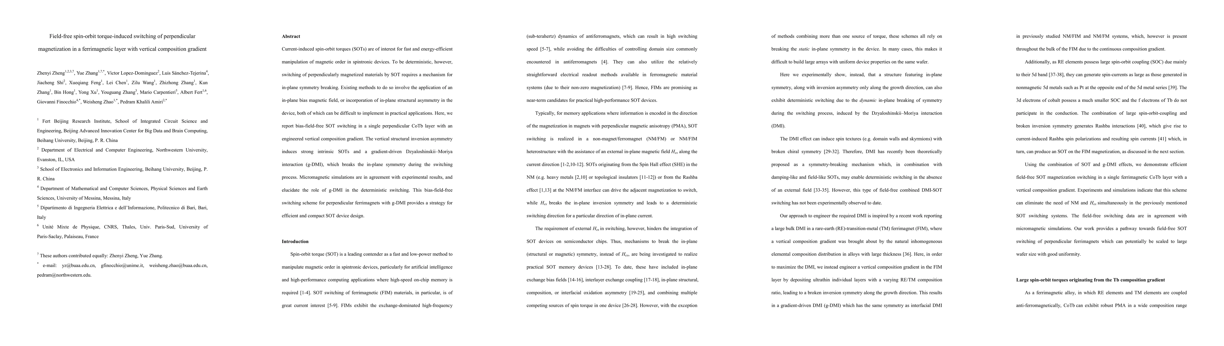This paper reports bias-field-free spin-orbit torque switching in a perpendicularly magnetized ferrimagnetic layer with a vertical composition gradient, utilizing intrinsic spin-orbit torques and gradient-driven Dzyaloshinskii-Moriya interaction for deterministic switching without an in-plane bias magnetic field. Micromagnetic simulations corroborate the experimental results and highlight the role of g-DMI in the switching process.