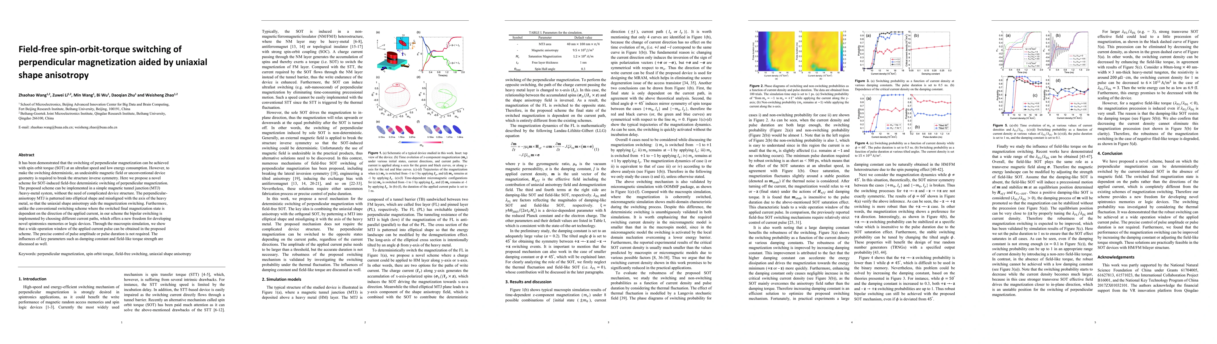 This paper proposes a novel scheme for field-free, deterministic switching of perpendicular magnetization in magnetic tunnel junctions using spin-orbit torque, aided by uniaxial shape anisotropy in elliptically shaped devices. This approach eliminates the need for magnetic fields or complex geometries, offering potential for new spintronics applications.