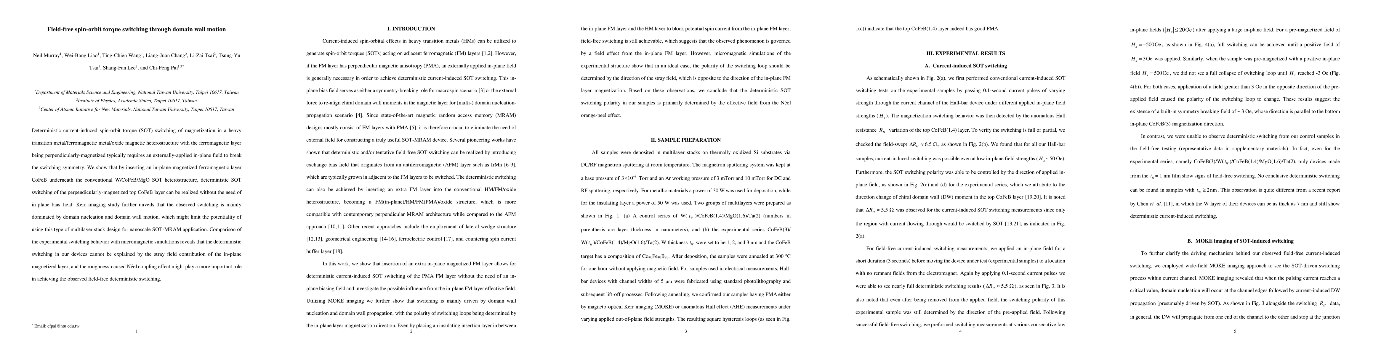 This paper demonstrates field-free spin-orbit torque switching in a magnetic heterostructure by utilizing domain wall motion, eliminating the need for an in-plane bias field. Micromagnetic simulations suggest that roughness-induced Néel coupling may contribute to this field-free switching, though it might limit nanoscale application potential.